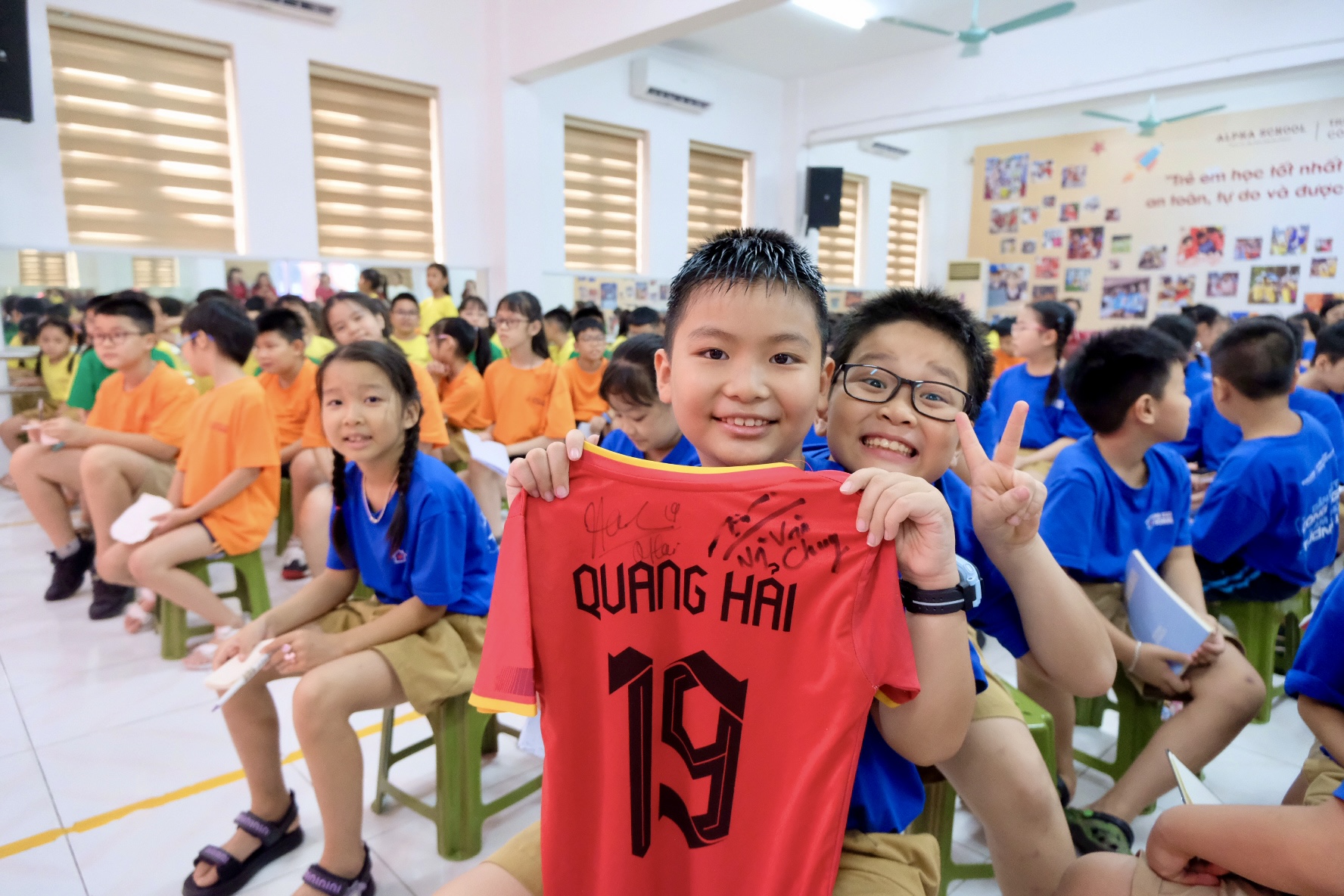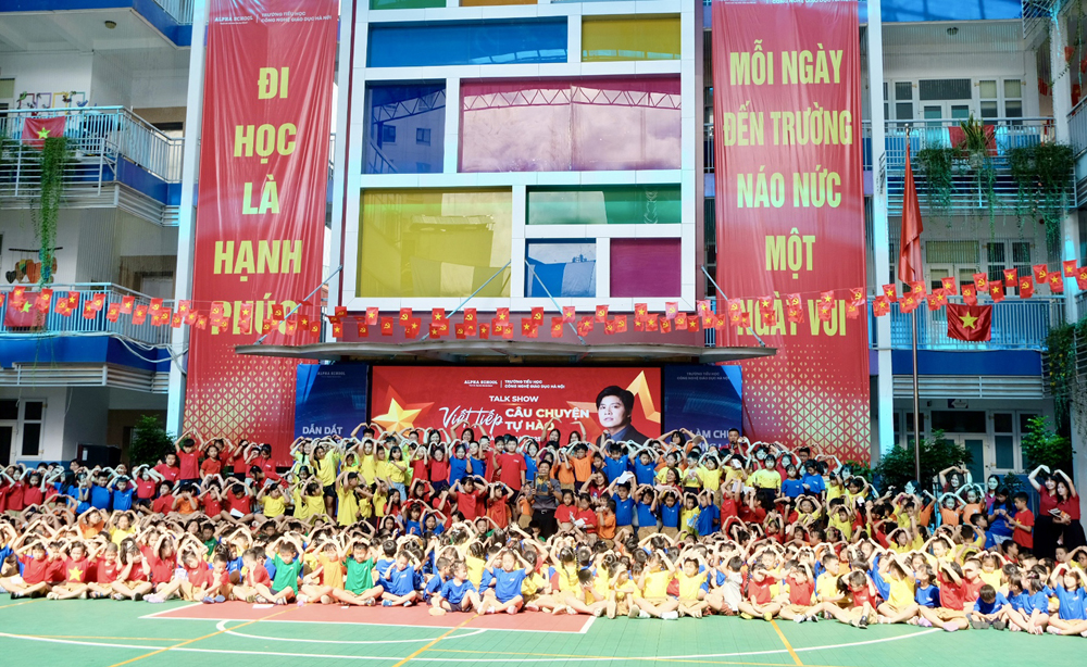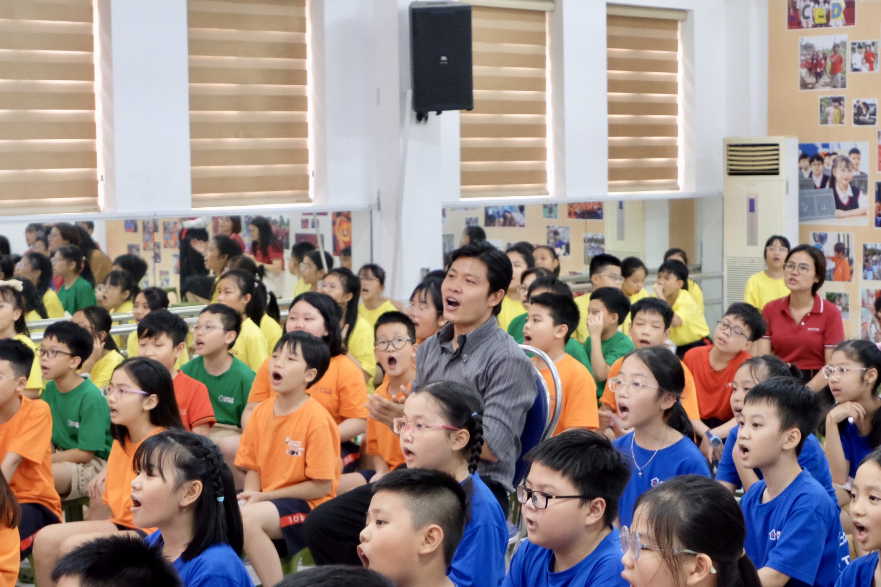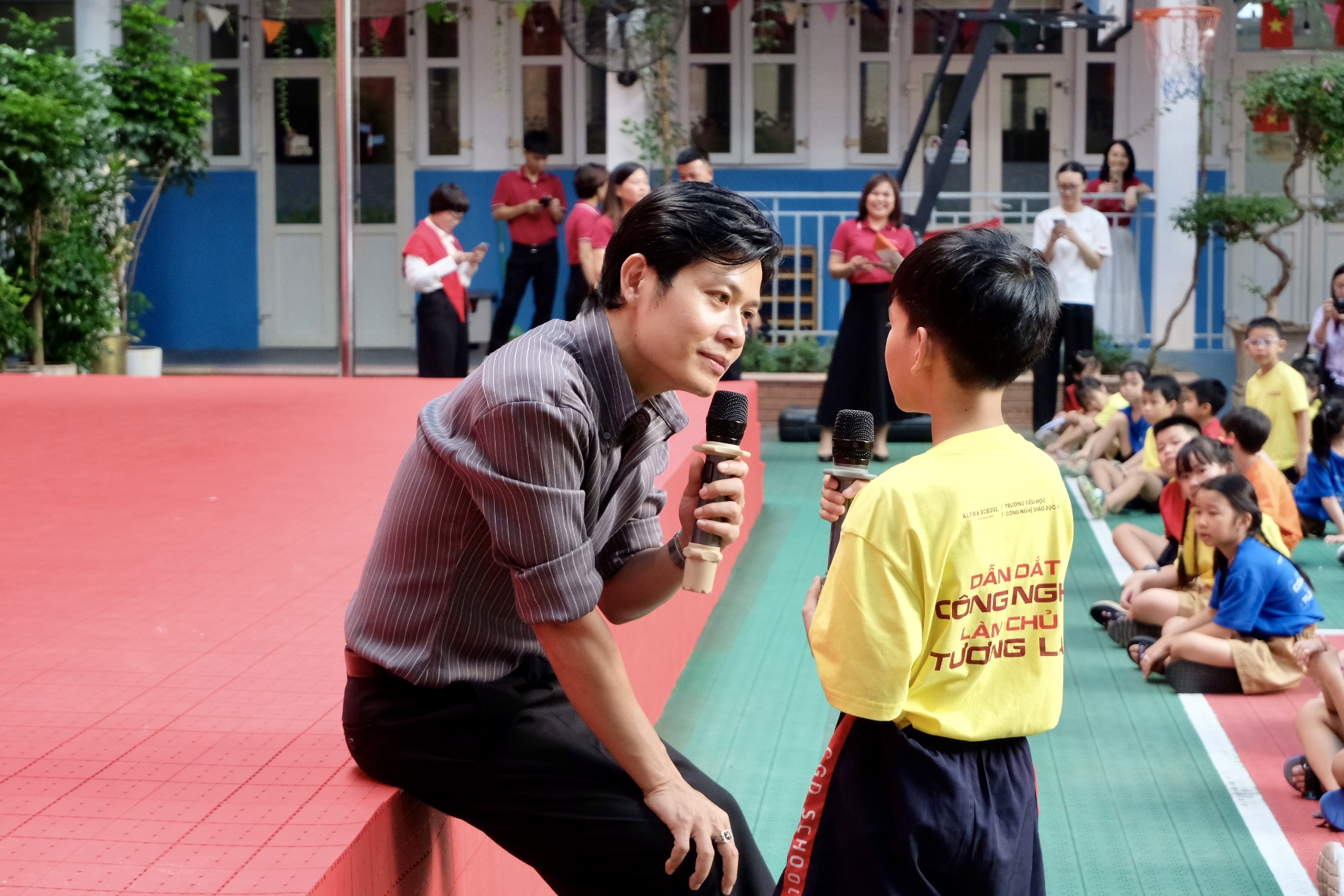 Sau phần giao lưu sôi động ngoài sân trường, chương trình tiếp tục diễn ra tại phòng đa năng. Các bạn học sinh mạnh dạn đặt câu hỏi, bày tỏ tình cảm và niềm ngưỡng mộ với tác già của nhiều ca khúc nổi tiếng dành cho thiếu nhi.