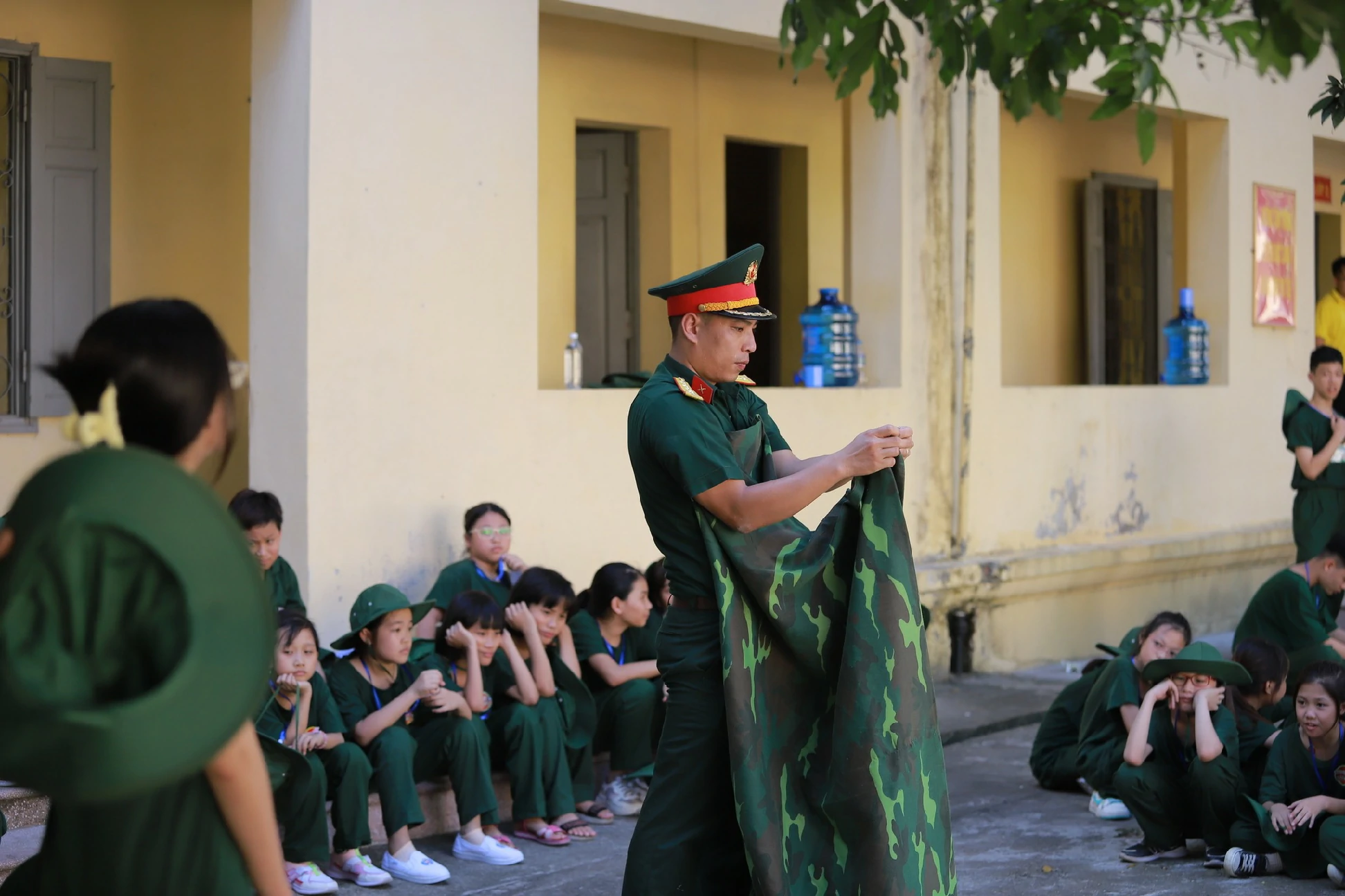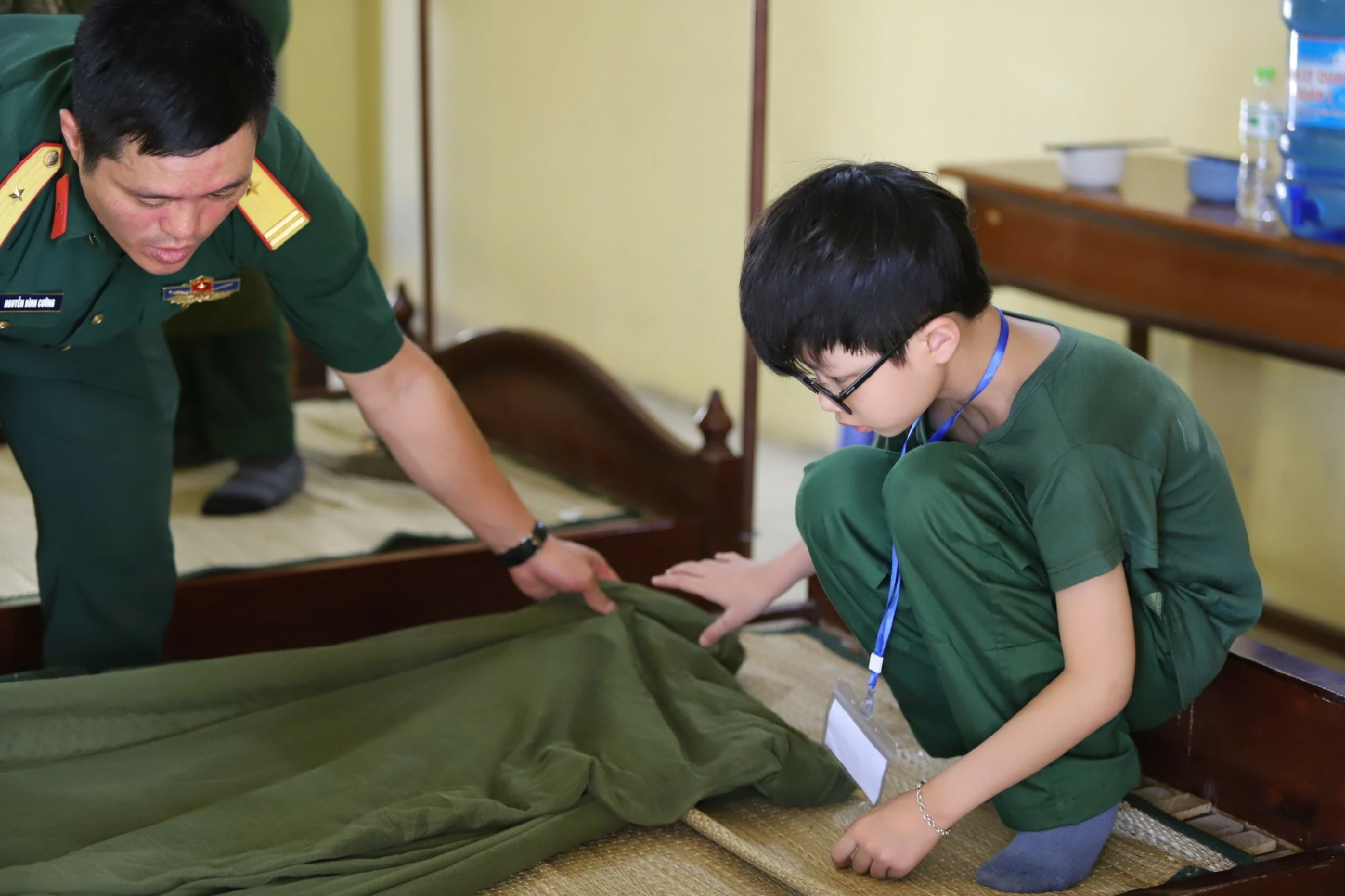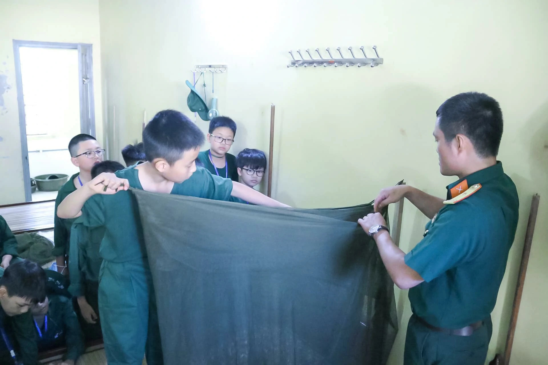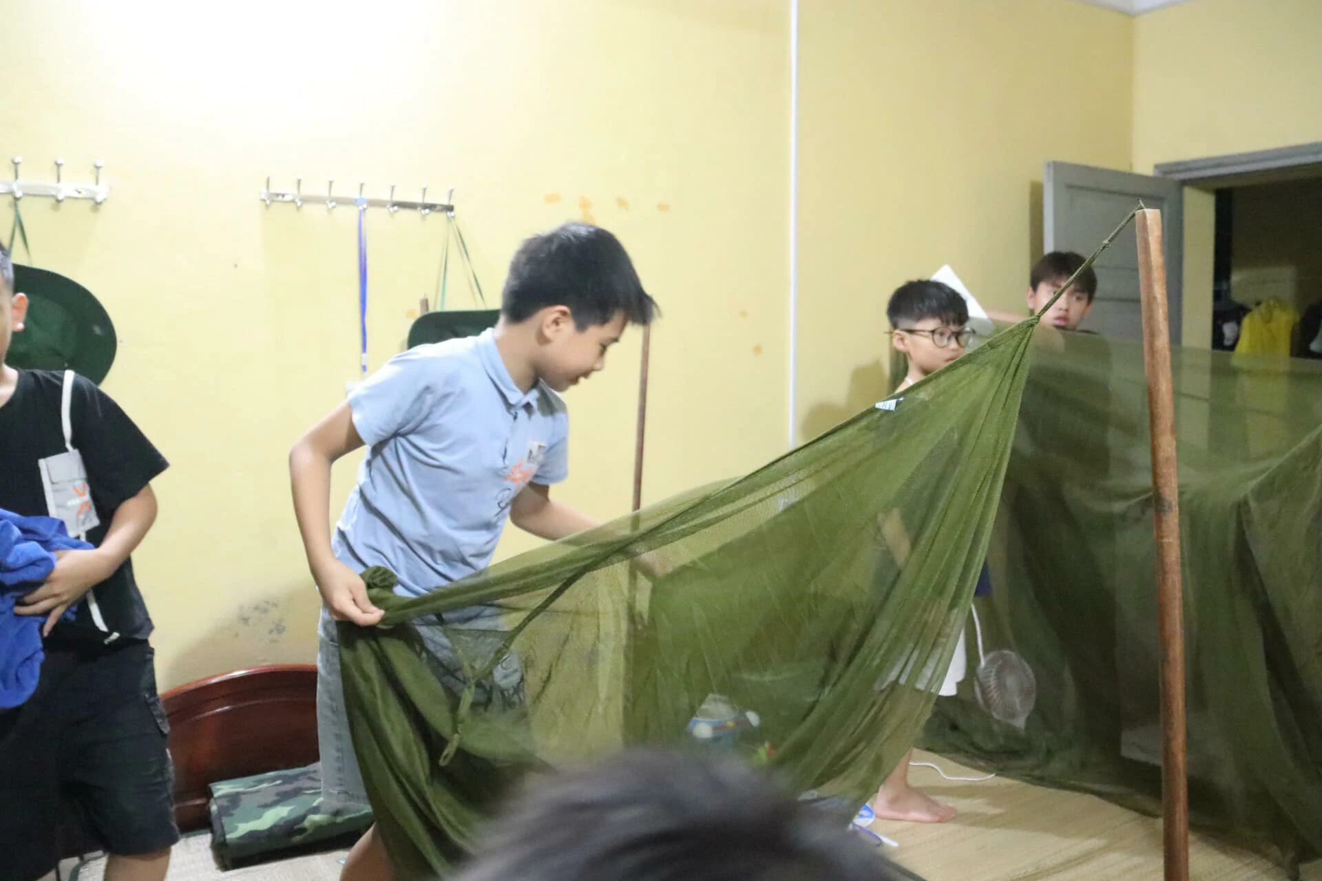 Sau khi đến địa điểm huấn luyện, các chiến sĩ đã được phân về các phòng và sinh hoạt theo tiểu đội của mình. Những giây phút làm quen còn rụt rè, e ngại lộ rõ trên khuôn mặt của các chiến sĩ nhí thật đáng yêu biết nhường nào. Nhưng với sự động viên khích lệ của các đồng chí điều phối viên, các chiến sĩ nhí của chúng ta cũng dần làm quen được với nhau, làm quen với những nội quy kỷ luật trong quân ngũ. ![]()