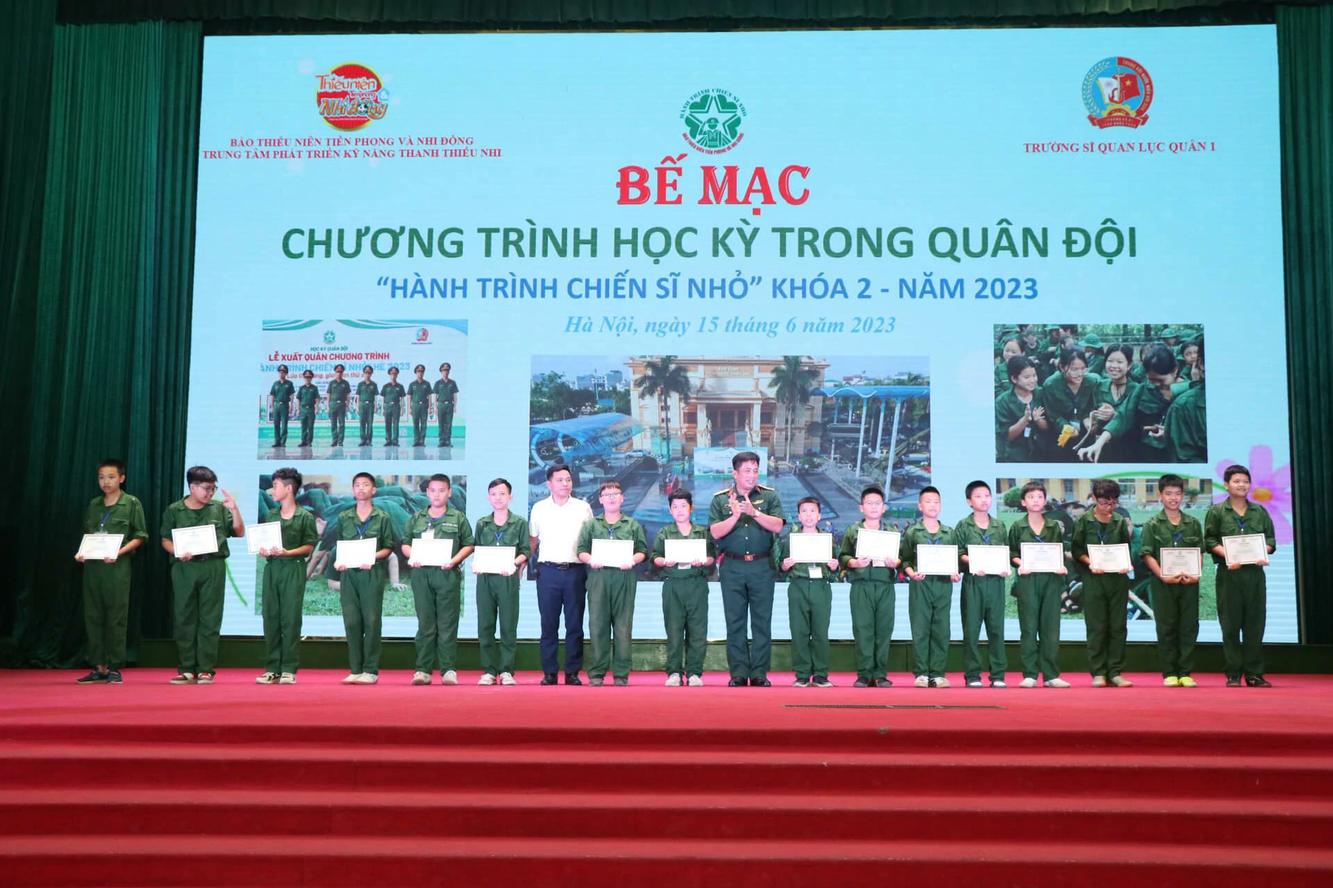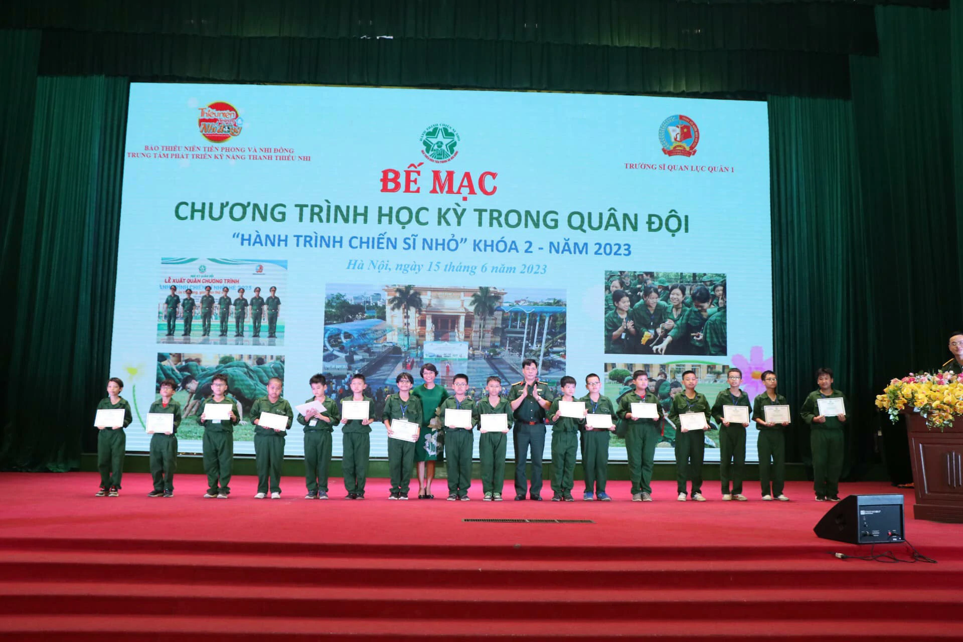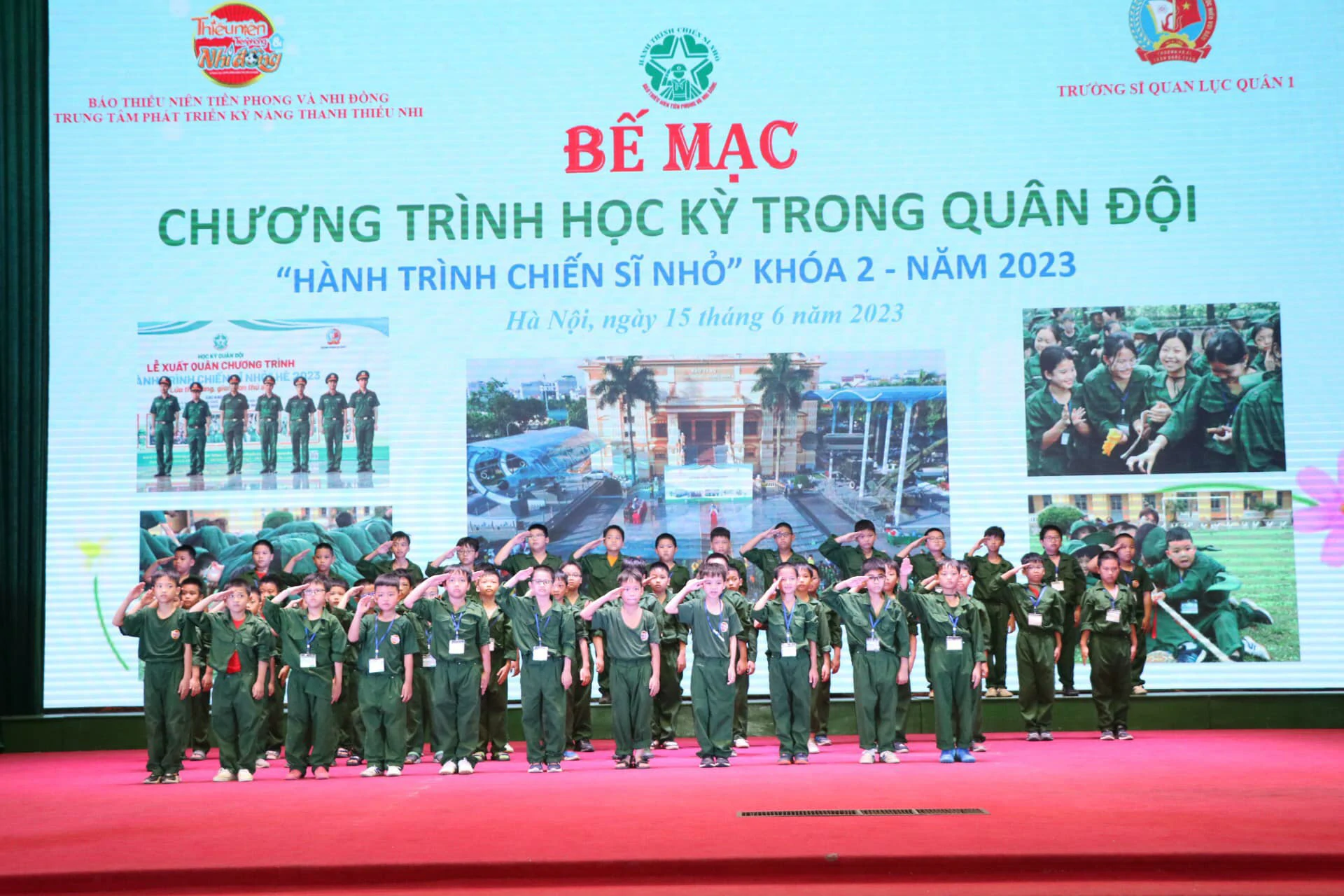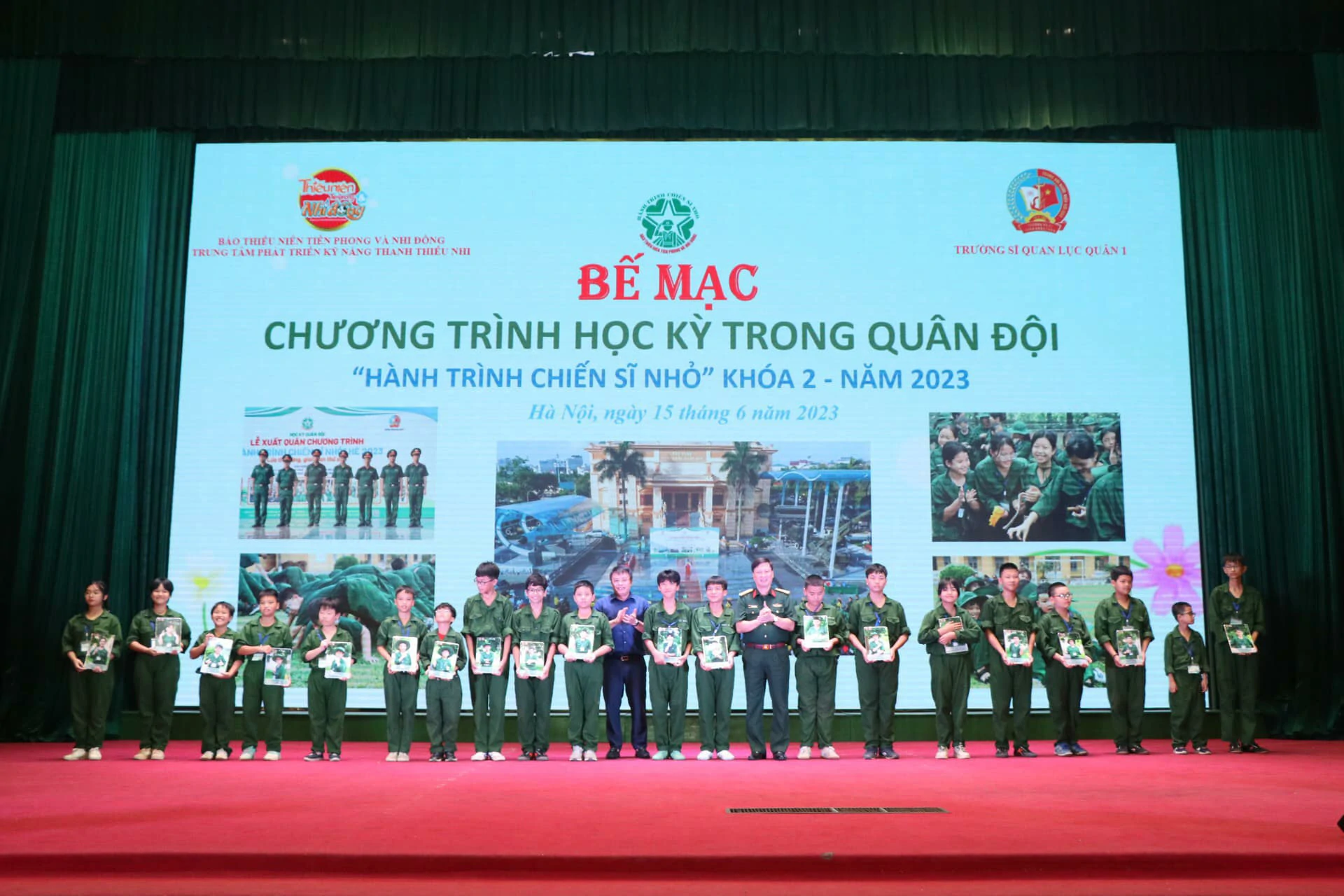 Thay mặt cho những người làm chương trình, chúng tôi xin được gửi lời cảm ơn chân thành nhất đến ban lãnh đạo, cán bộ Trường Sĩ quan Lục quân 1 đã quan tâm, chỉ sát sao để chương trình được diễn ra thành công. Cảm ơn Quý vị phụ huynh đã tin tưởng, ủng hộ và tạo điều kiện cho con em mình tham gia chương trình. Đặc biệt, xin được gửi lời cảm ơn sâu sắc nhất đến hơn 250 chiến sĩ nhí của chúng ta đã luôn cố gắng, nỗ lực trong suốt 8 ngày vừa qua. ![]()