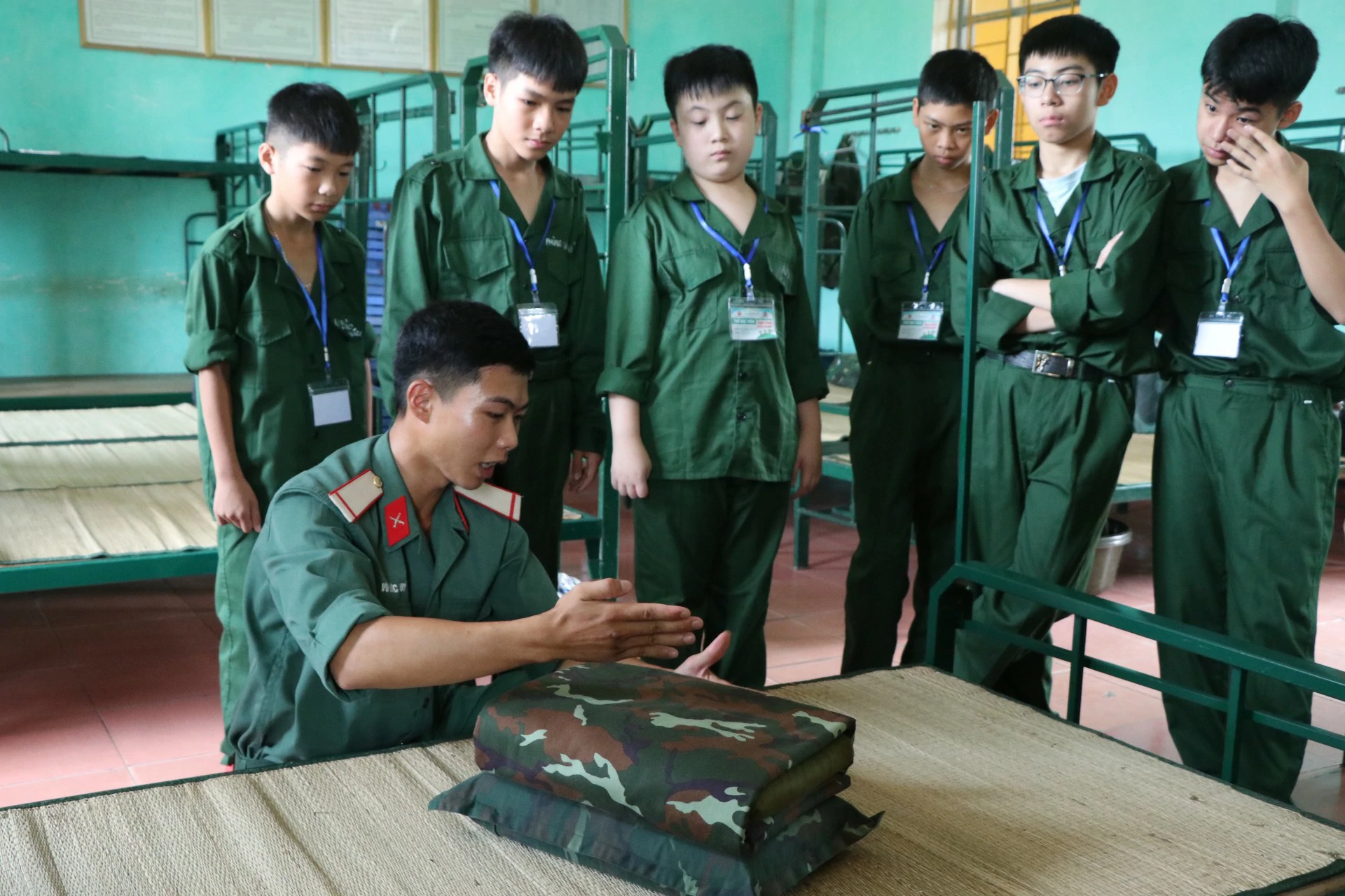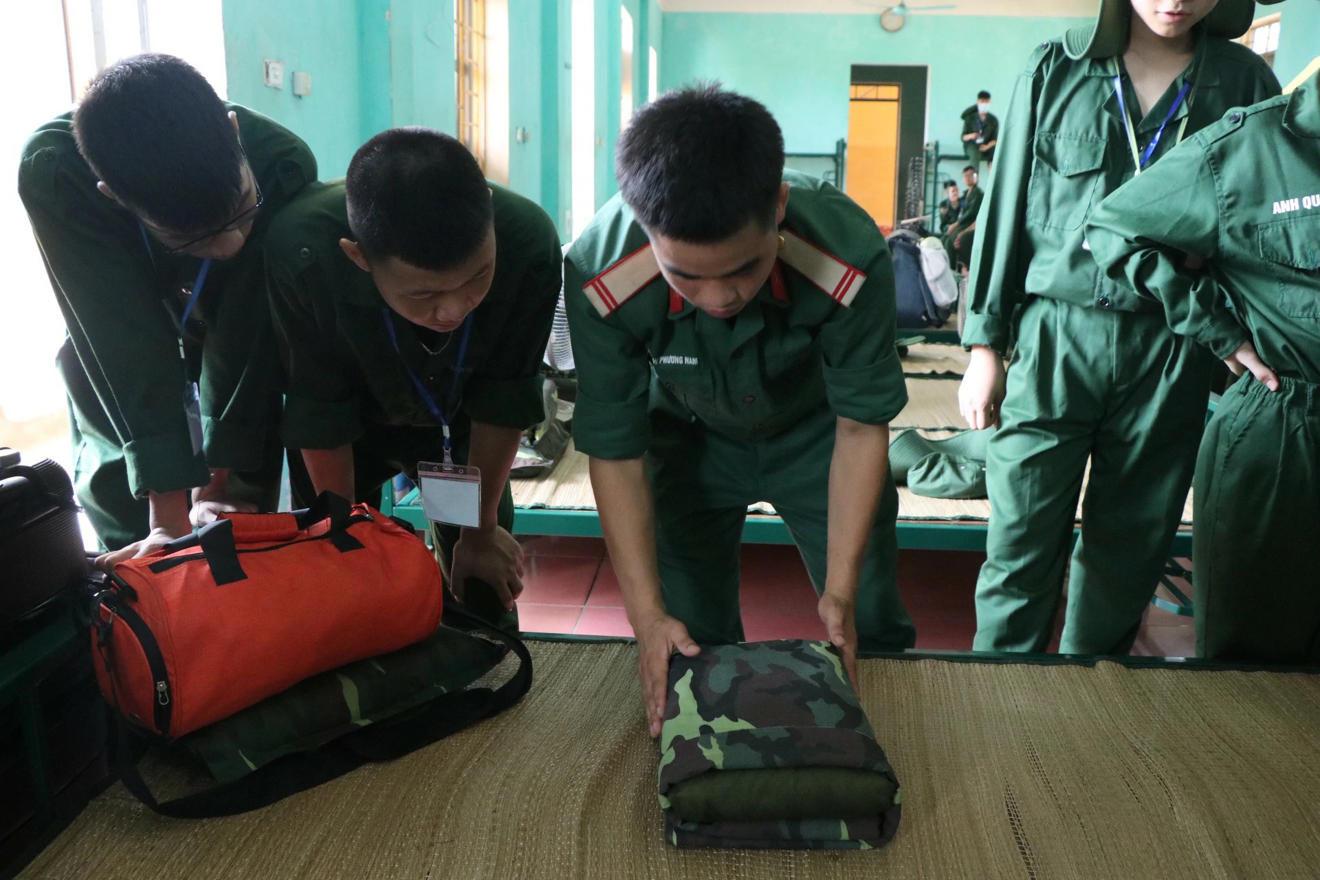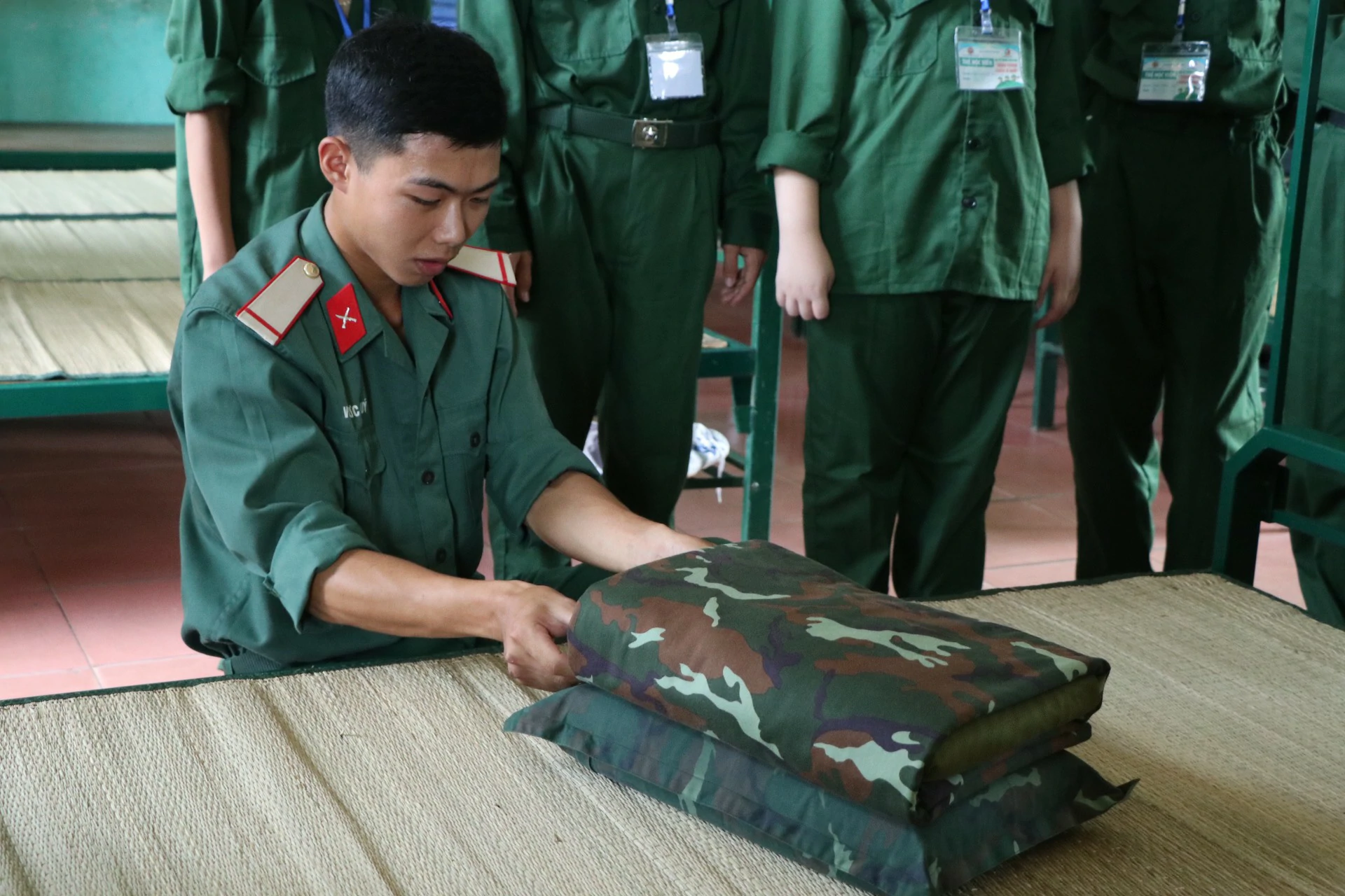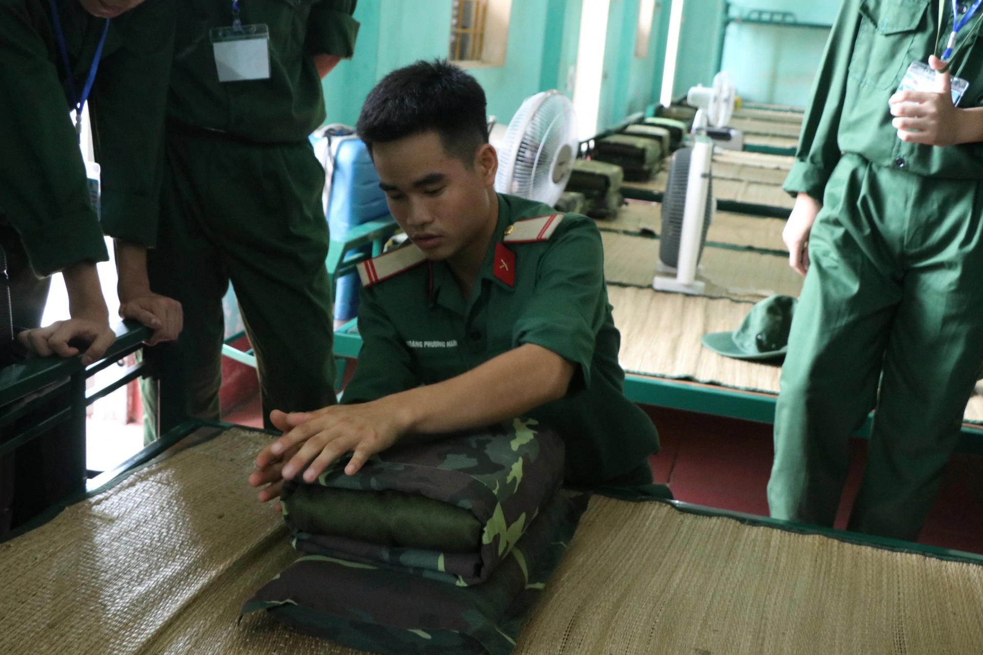 Sau khi ăn uống và nghỉ trưa xong, các chiến sĩ được tham gia kiểm tra sức khoẻ và học sắp xếp nội vụ (chăn, màn, quân tư trang cá nhân, giặt quần áo…) ![]()