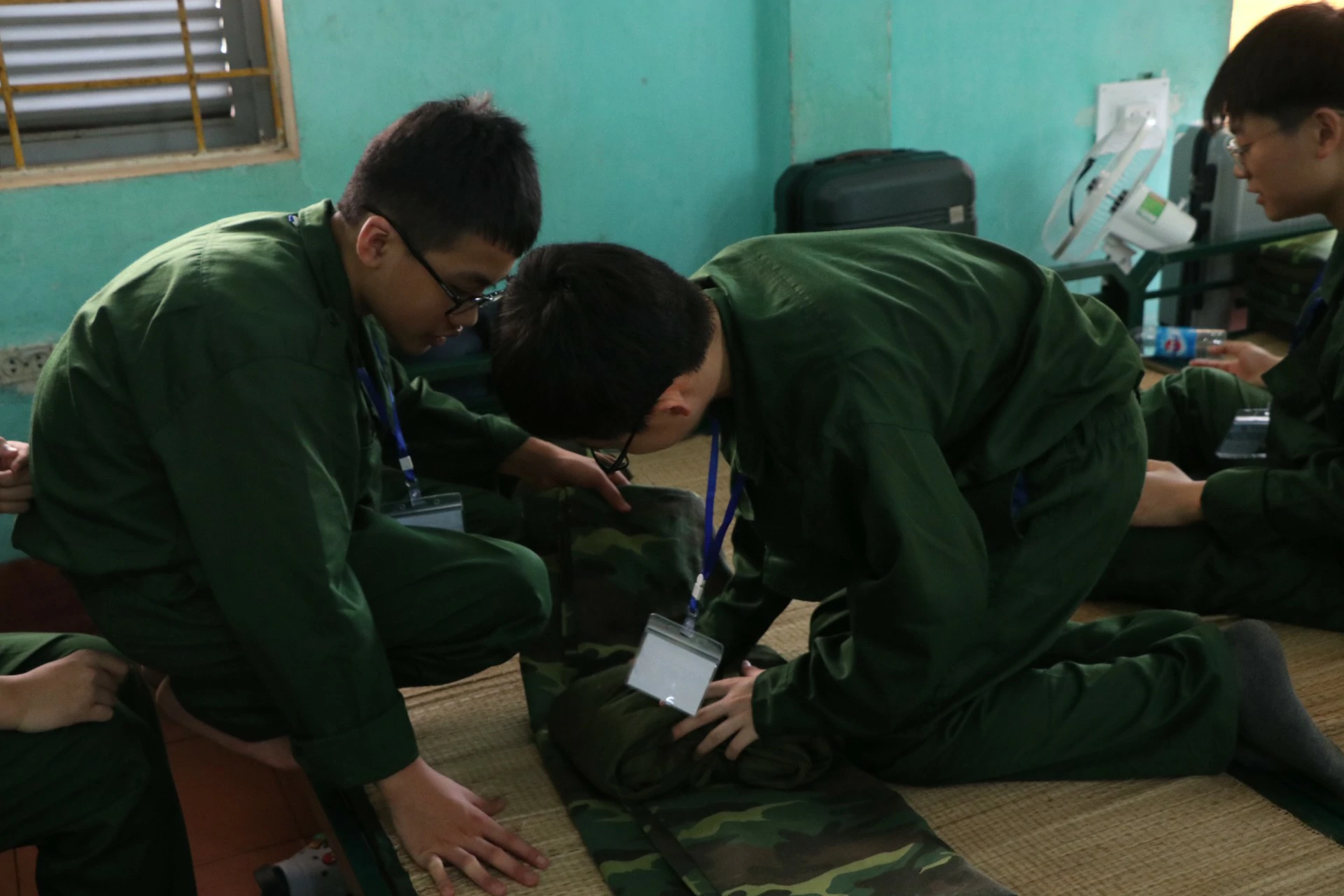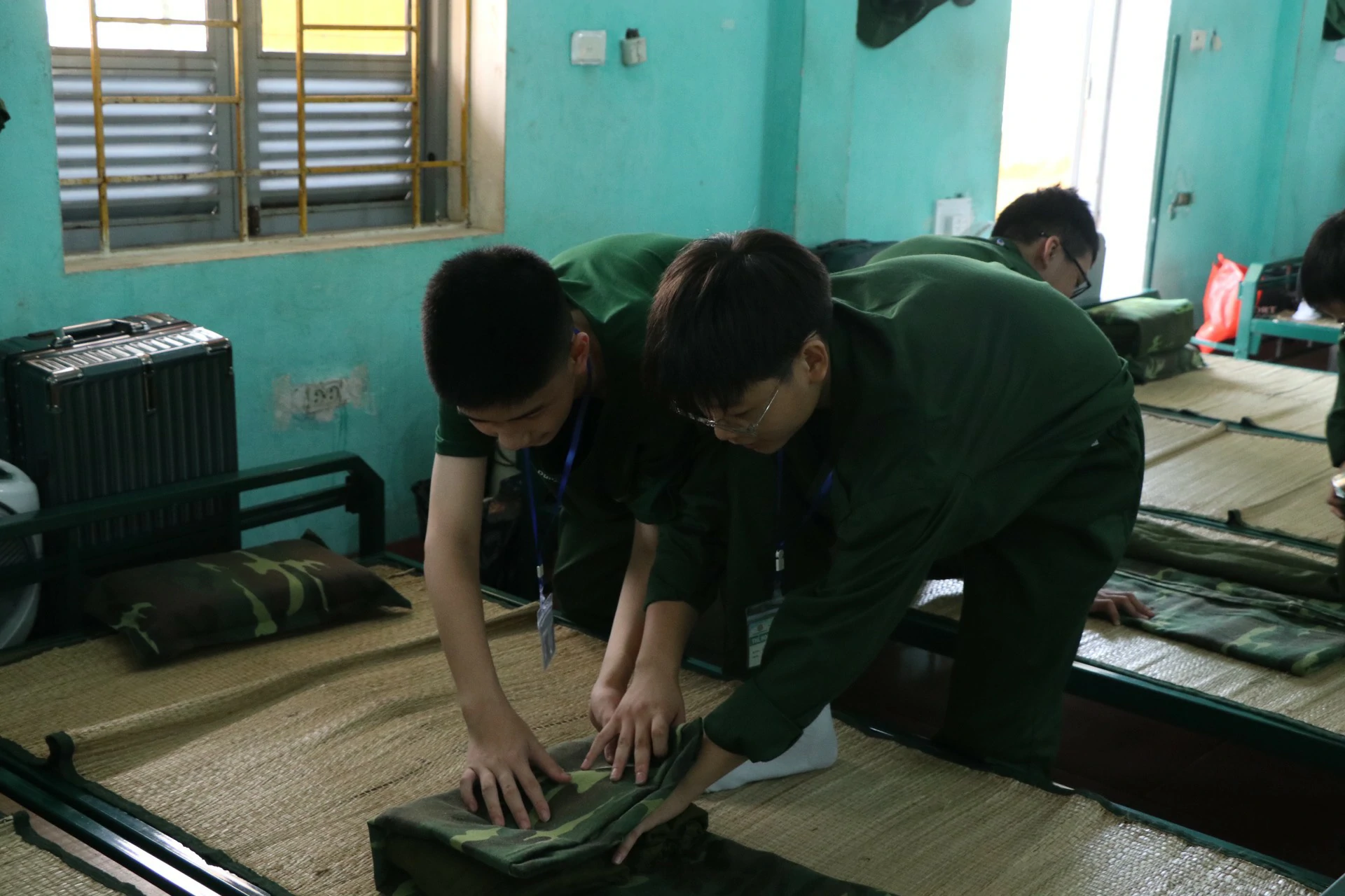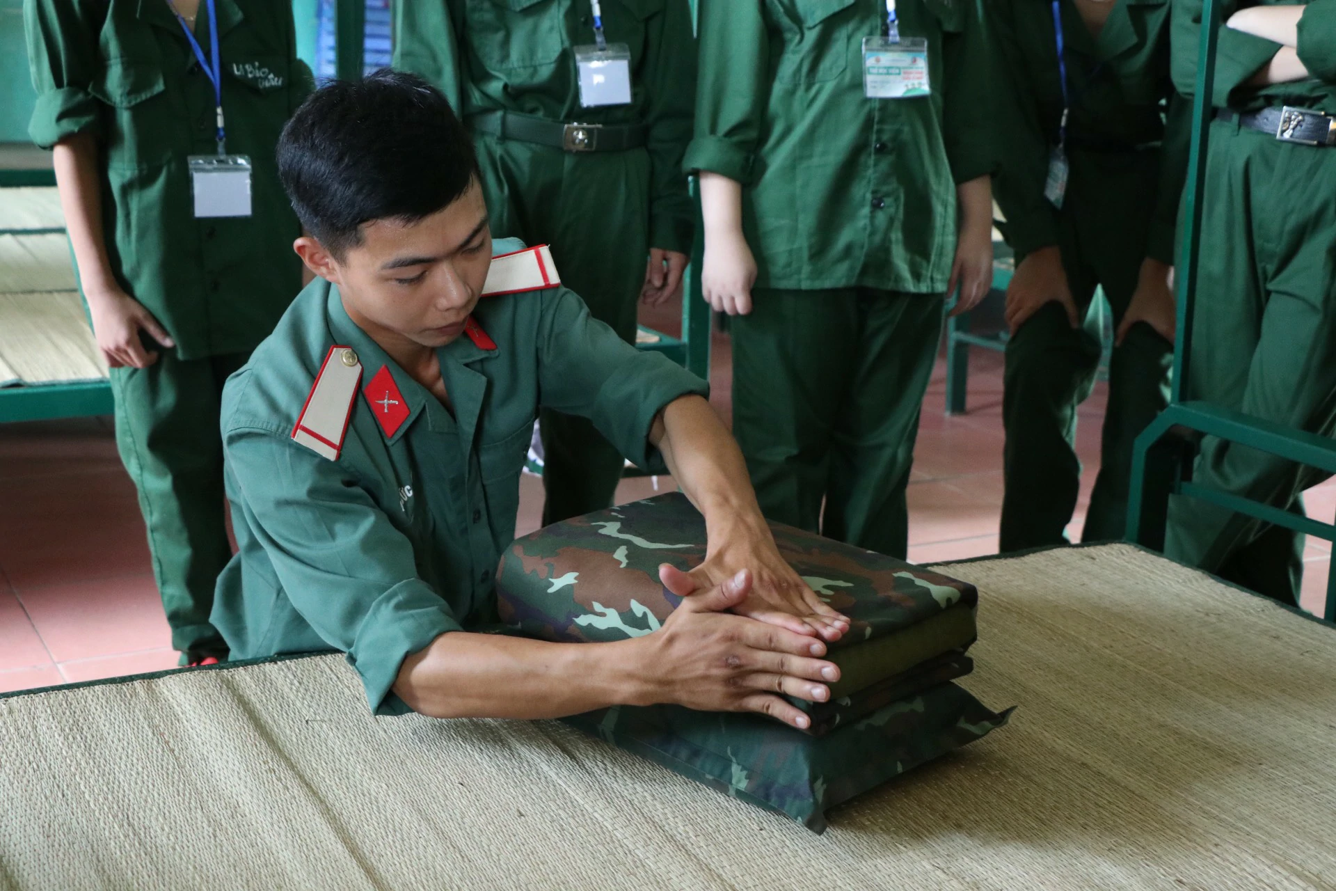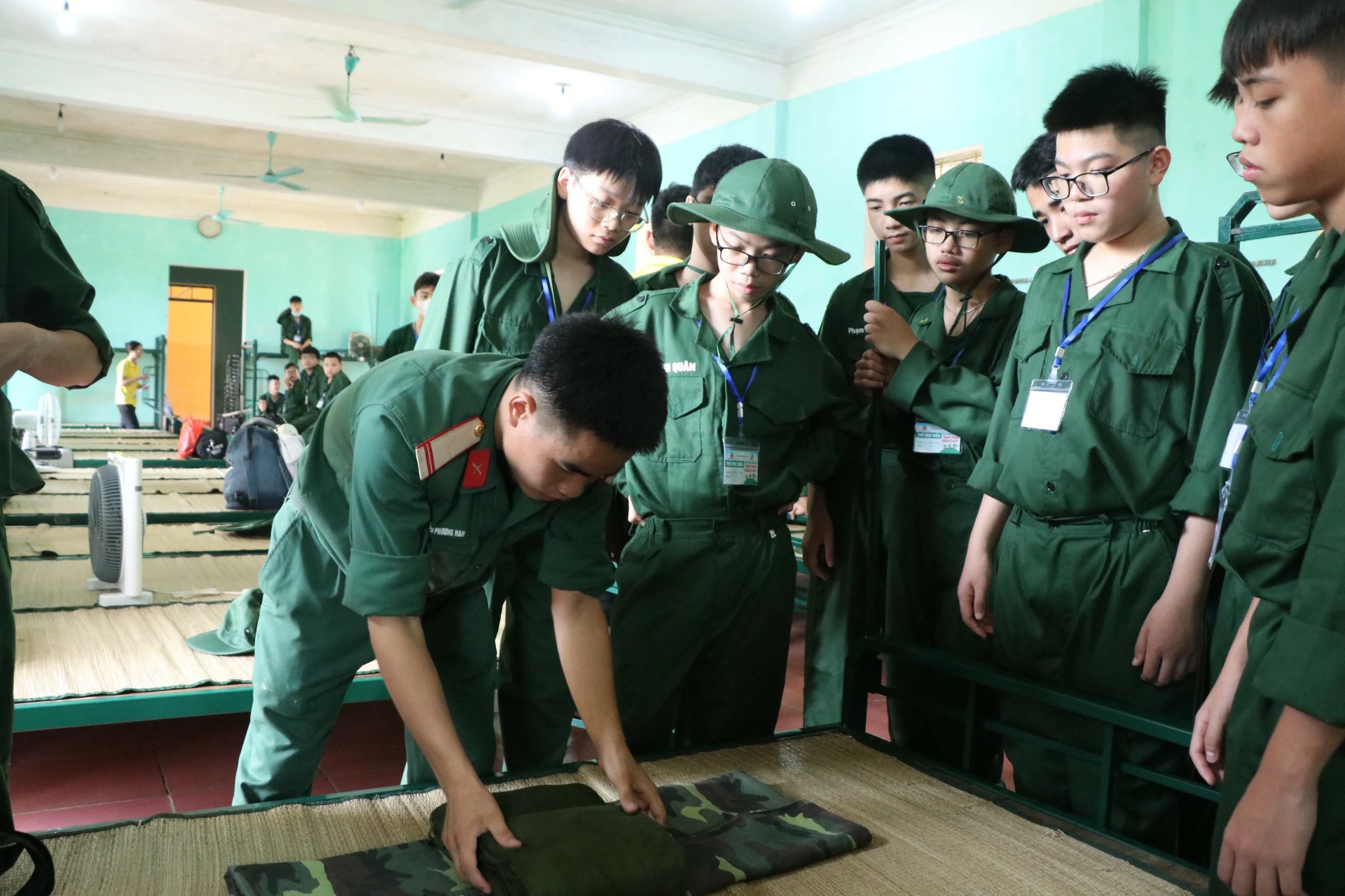 Sau khi ăn uống và nghỉ trưa xong, các chiến sĩ được tham gia kiểm tra sức khoẻ và học sắp xếp nội vụ (chăn, màn, quân tư trang cá nhân, giặt quần áo…) ![]()