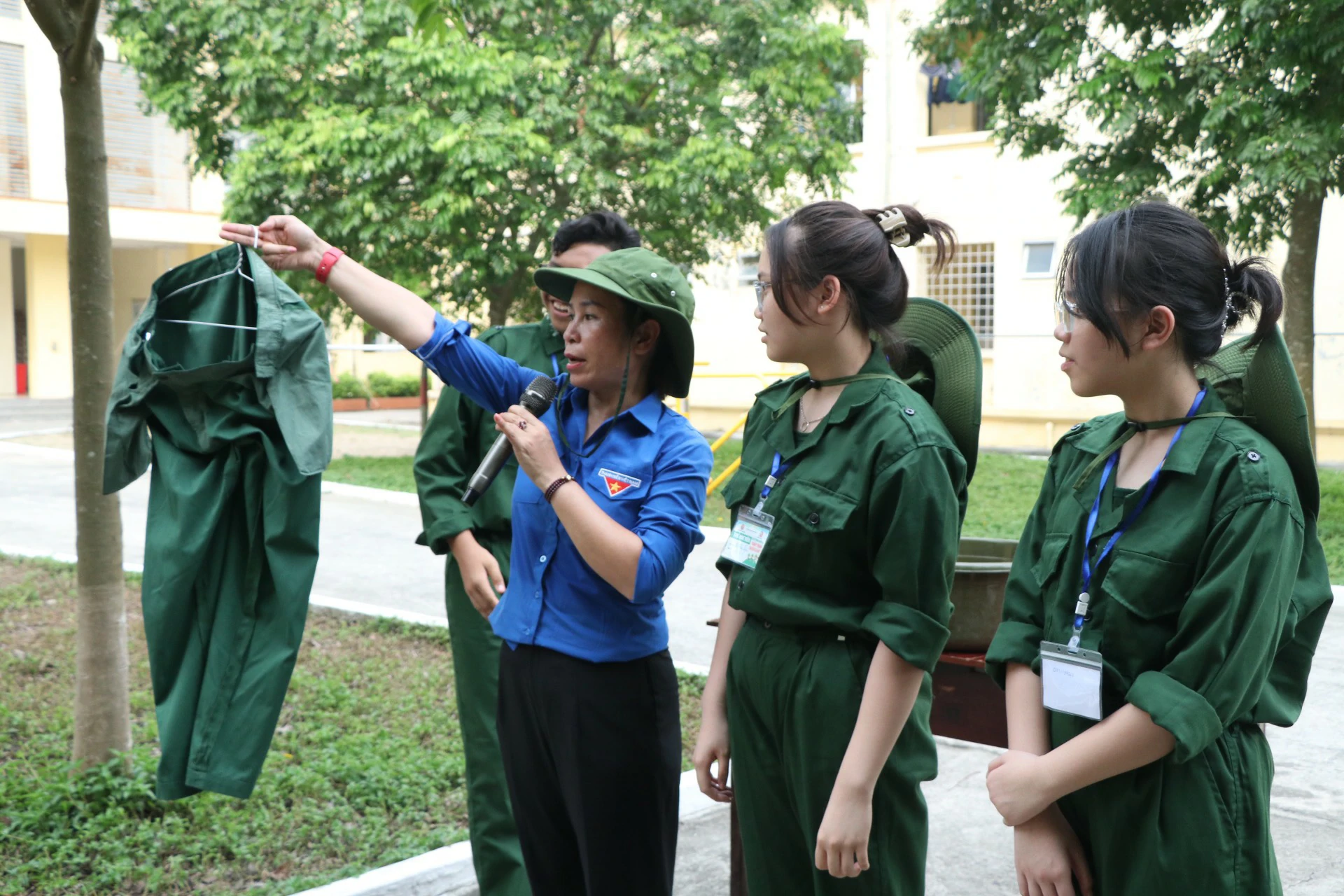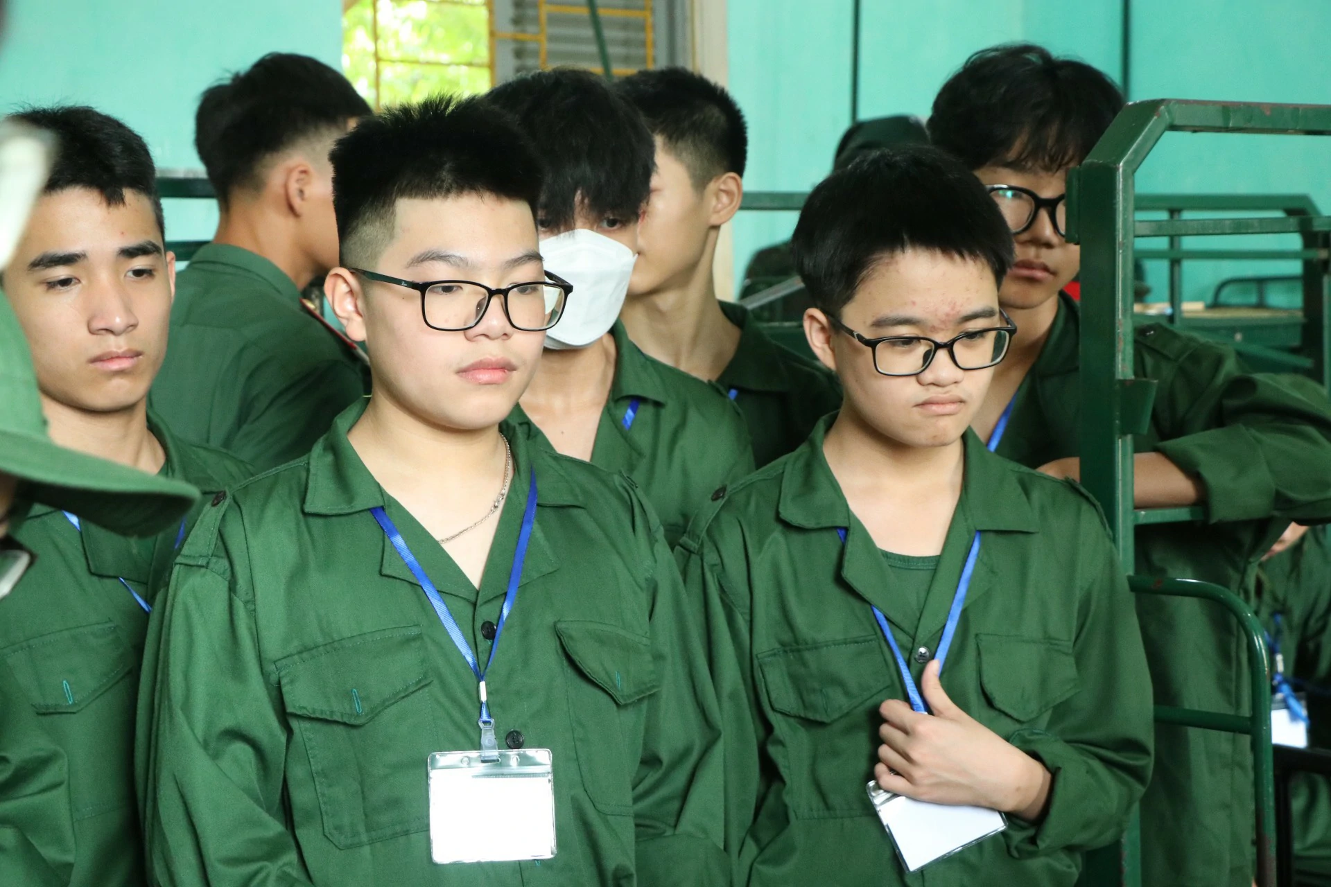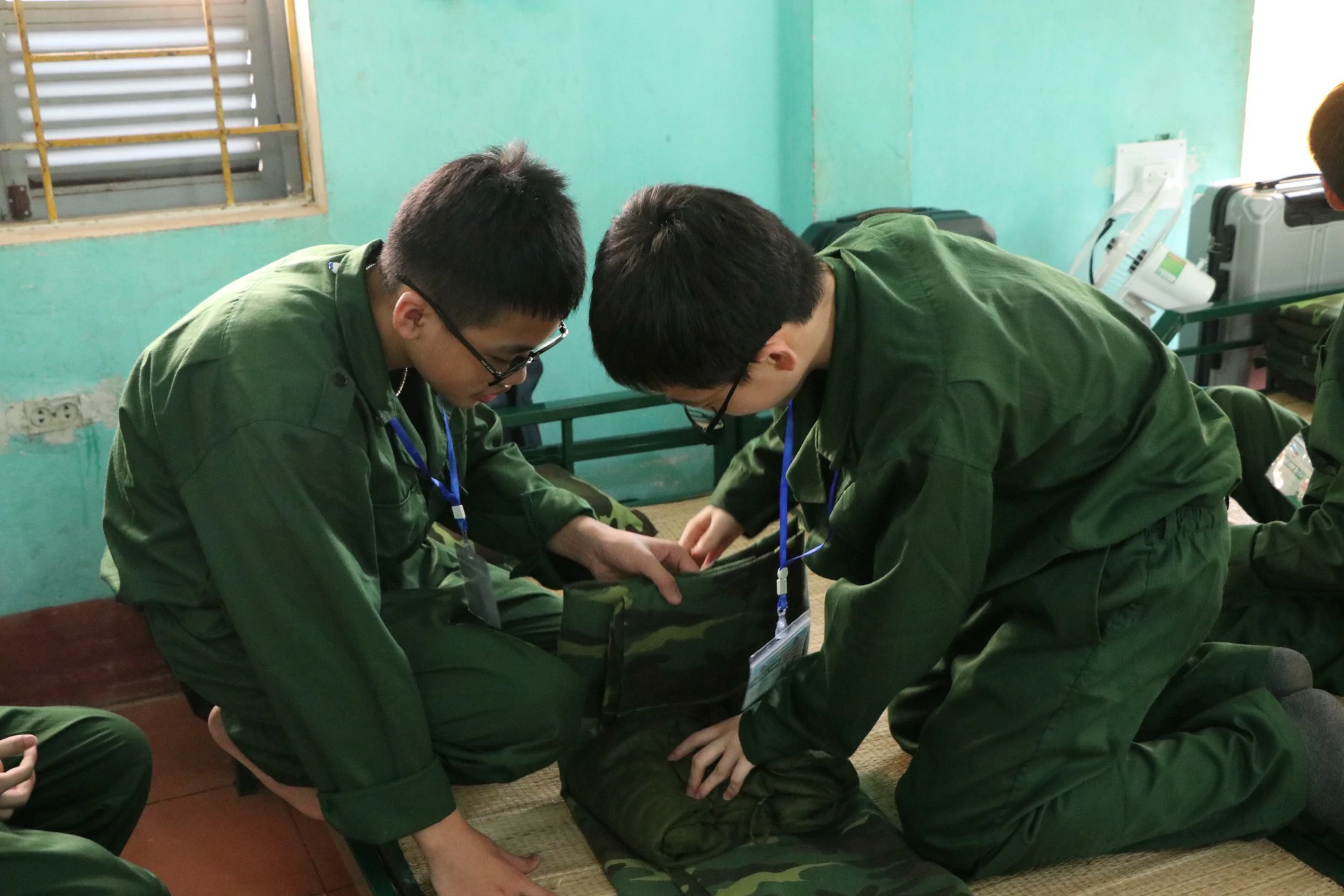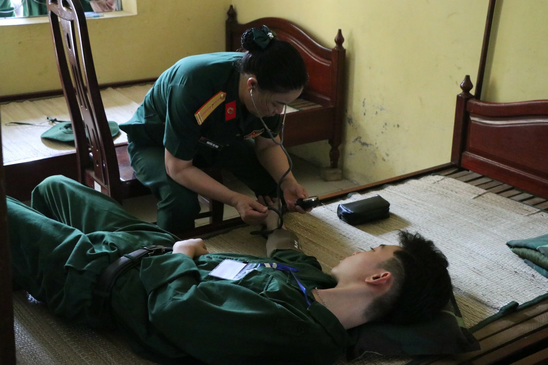 Sau khi ăn uống và nghỉ trưa xong, các chiến sĩ được tham gia kiểm tra sức khoẻ và học sắp xếp nội vụ (chăn, màn, quân tư trang cá nhân, giặt quần áo…) ![]()