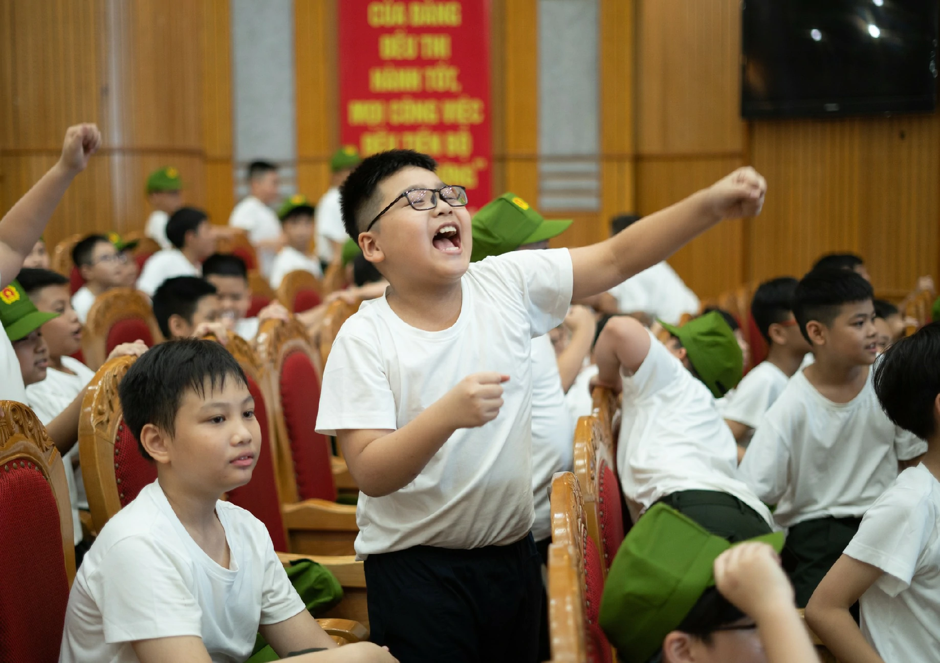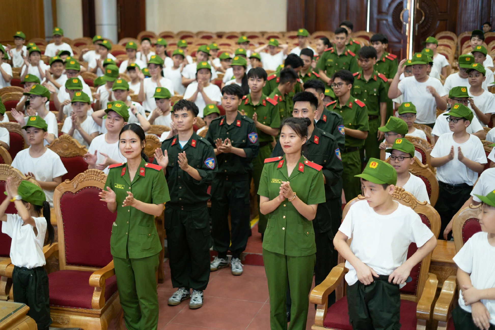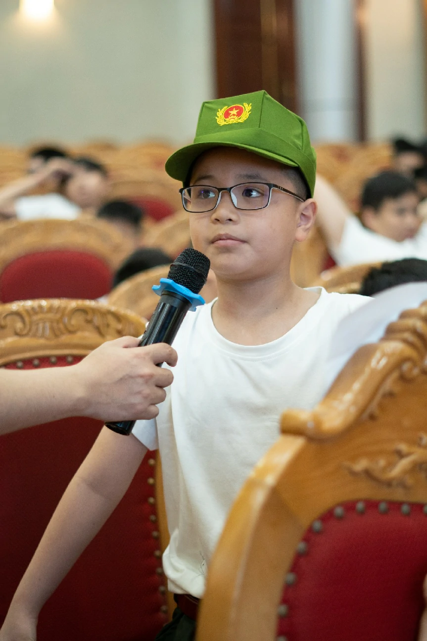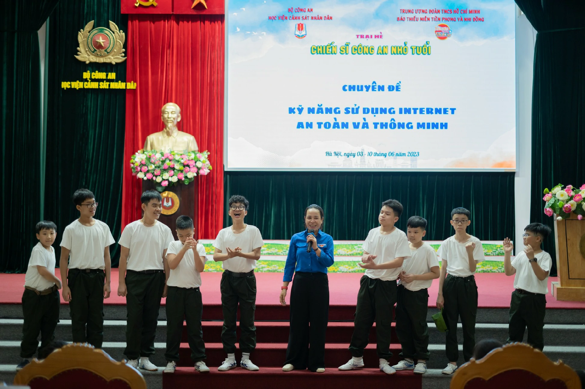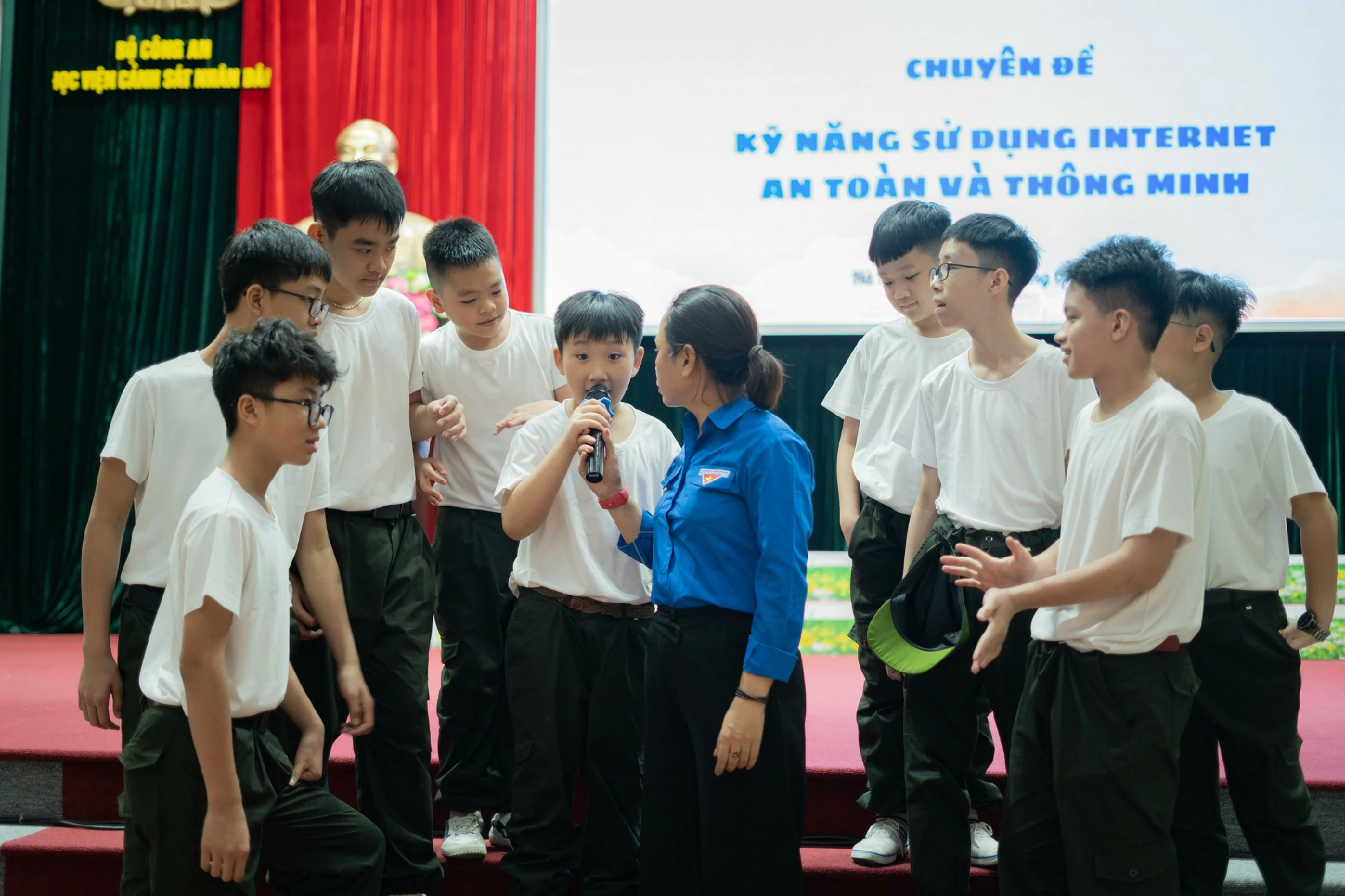au khi ăn sáng, các chiến sĩ công an nhí bắt đầu sinh hoạt tiểu đội rồi di chuyển về hội trường Trần Đức Trường để đến với chuyên đề: ” Kỹ năng sử dụng Internet an toàn và thông minh” ![]()