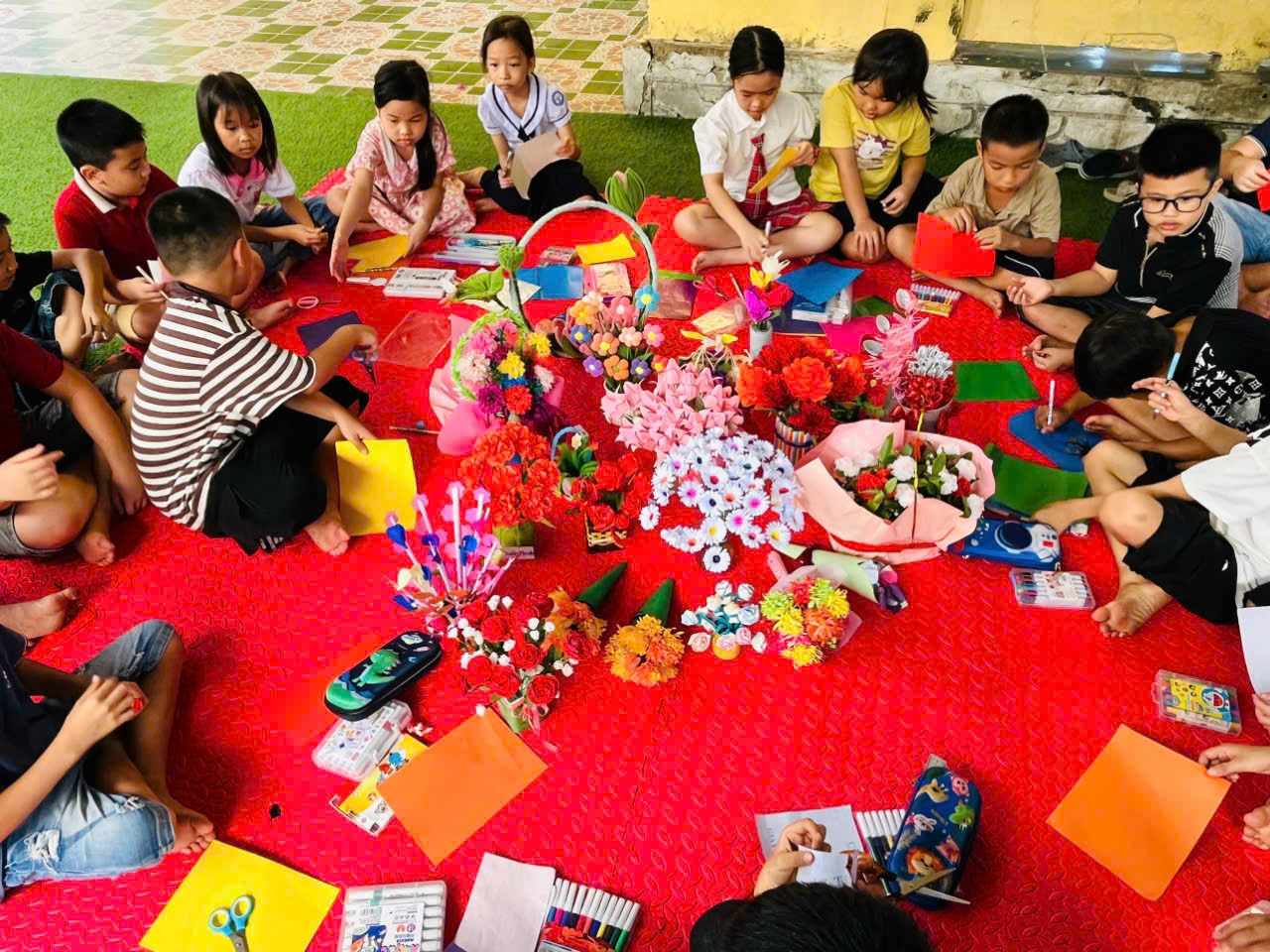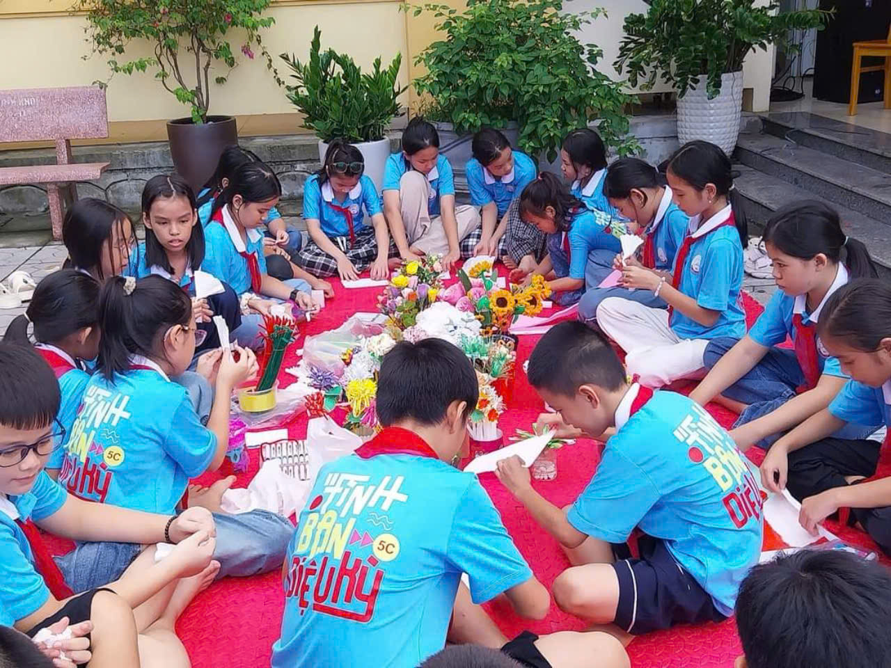 Với sự tham gia của tất cả các khối lớp, các bạn đã tự tay làm nên những bông hoa xinh đẹp từ các vật liệu tái chế như giấy báo cũ, chai nhựa, ống hút và bìa carton... Các em đã được hướng dẫn cẩn thận từng bước để tạo nên những bông hoa độc đáo và mang đậm dấu ấn cá nhân.