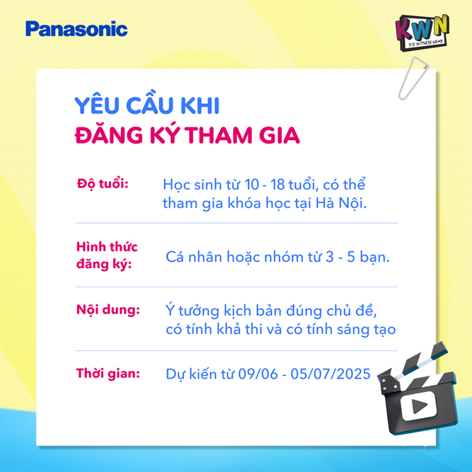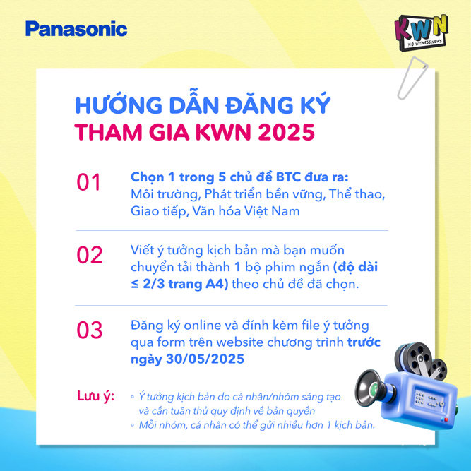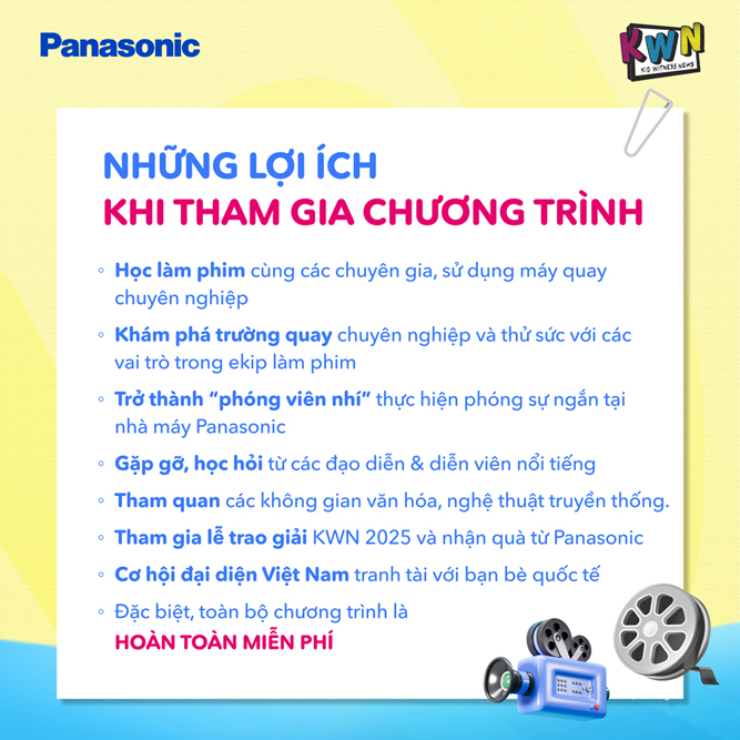 Panasonic chính thức mở đơn đăng ký tham gia chương trình “Qua ống kính trẻ thơ – Kid Witness News (KWN) 2025” - một chương trình hoàn toàn miễn phí dành cho học sinh từ 10 đến 18 tuổi trên toàn quốc, mang đến cho các em cơ hội khám phá nghệ thuật làm phim, phát triển kỹ năng mềm và thể hiện góc nhìn cá nhân về các vấn đề xã hội, biến mùa hè của mình thành một bộ phim đầy màu sắc.
