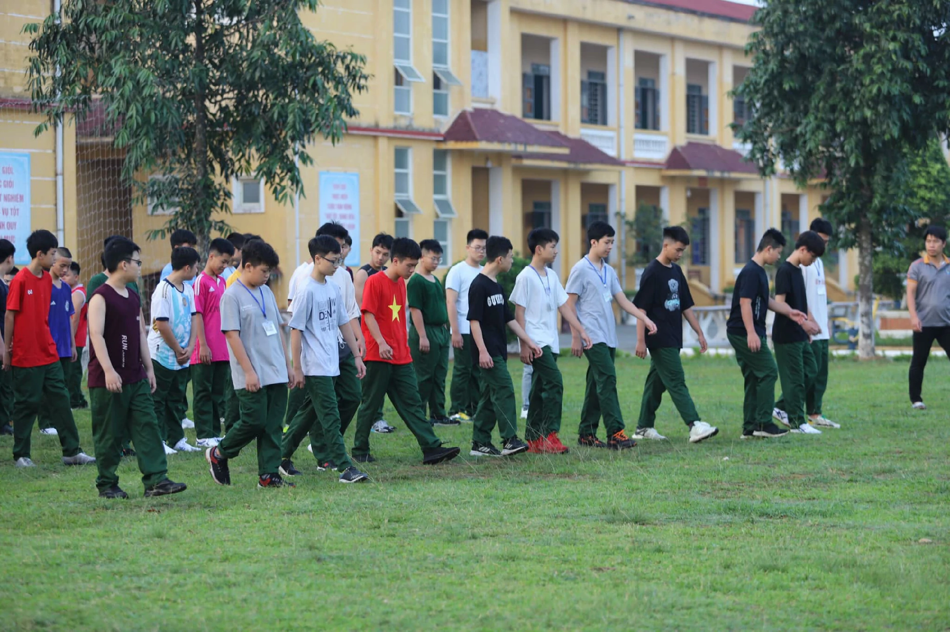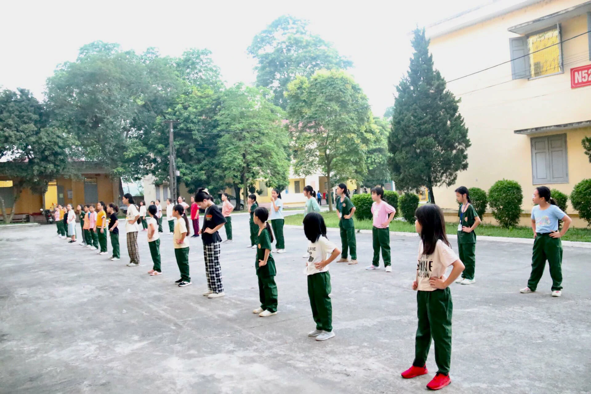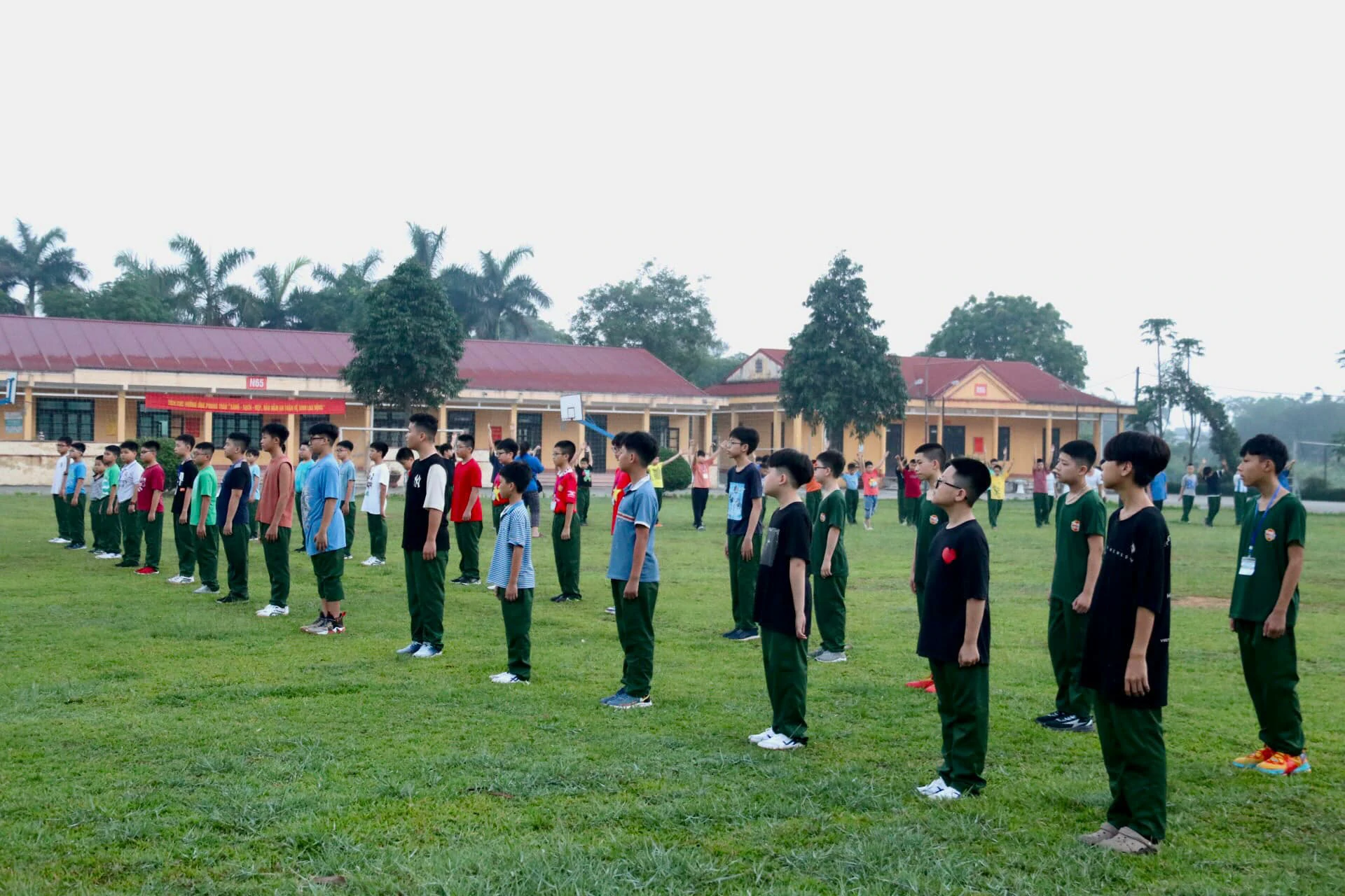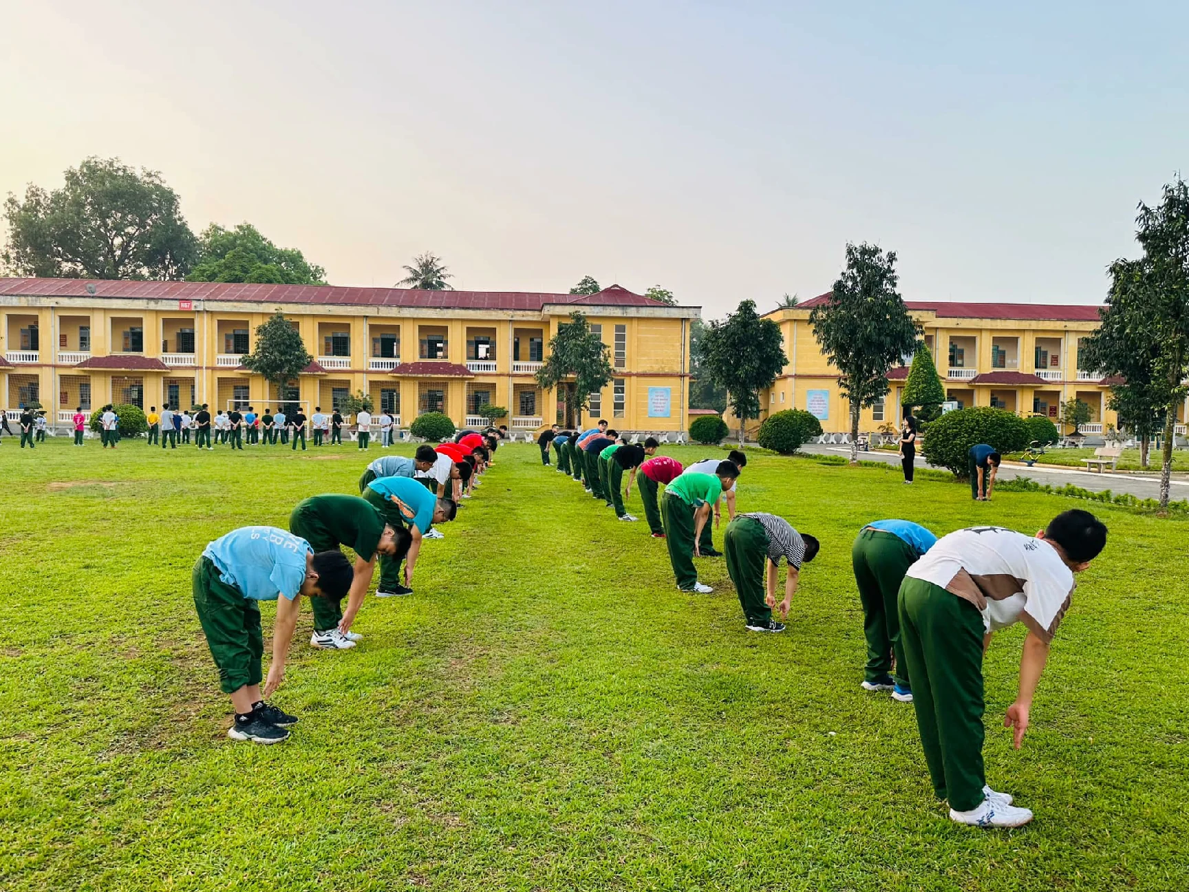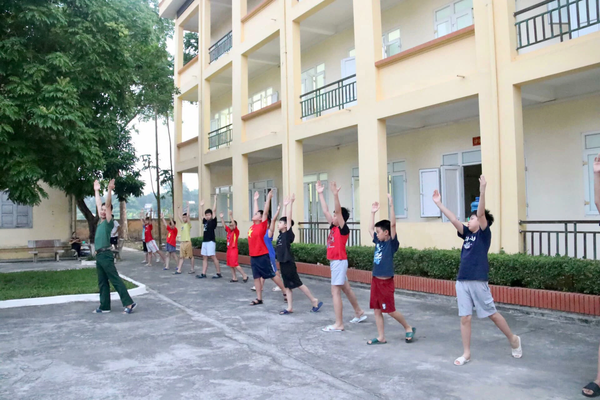 Buổi sáng đầu tiên thức dậy tại Trường Sĩ quan Lục quân 1 với không khí trong lành, thoáng mát, các chiến sĩ nhí đã được báo thức từ 5 giờ theo đúng quy định để tập thể dục.