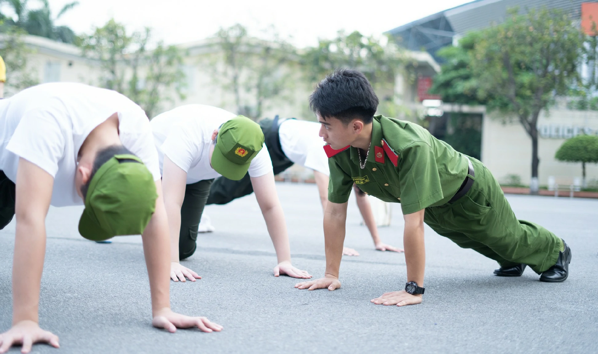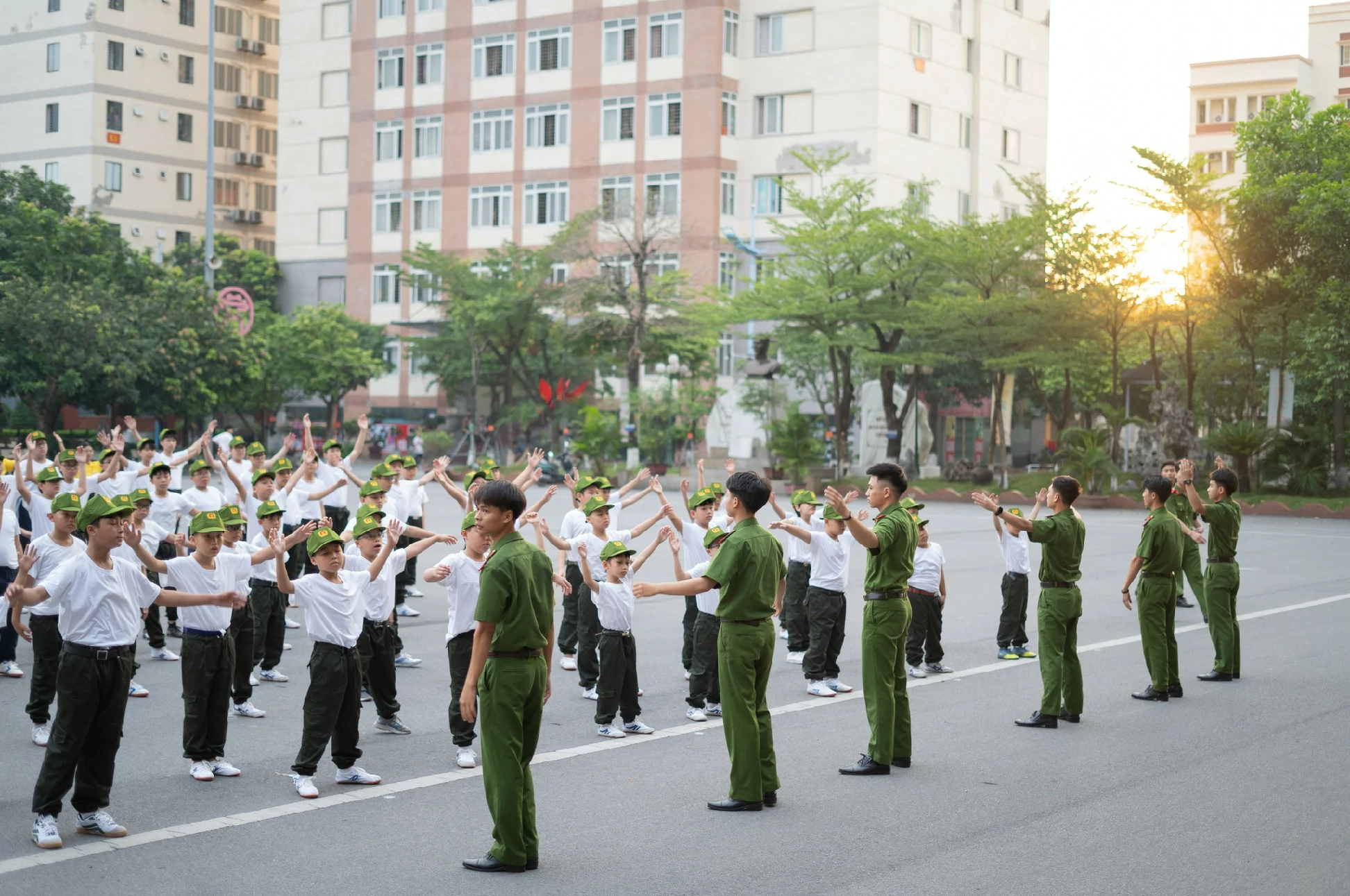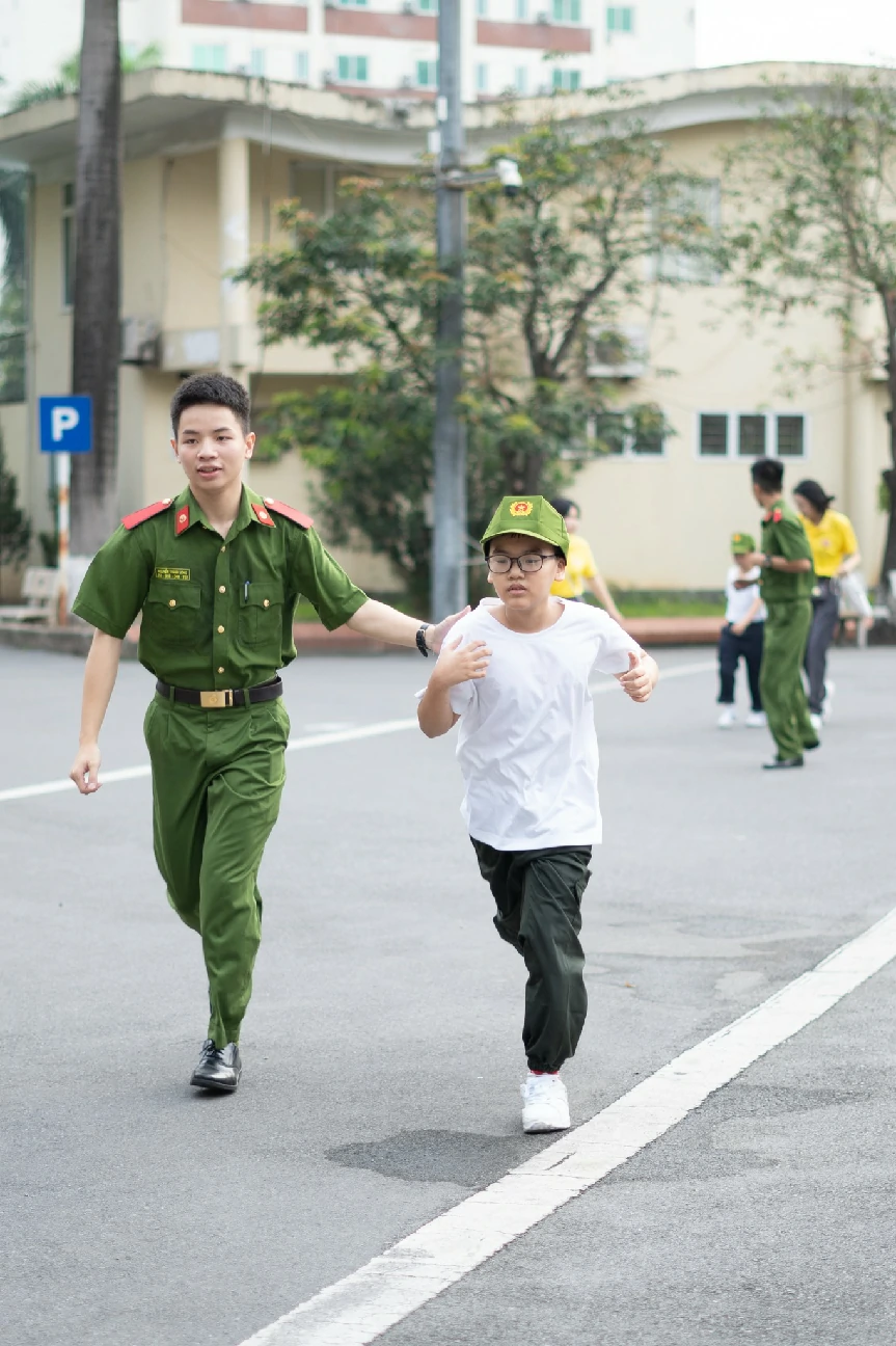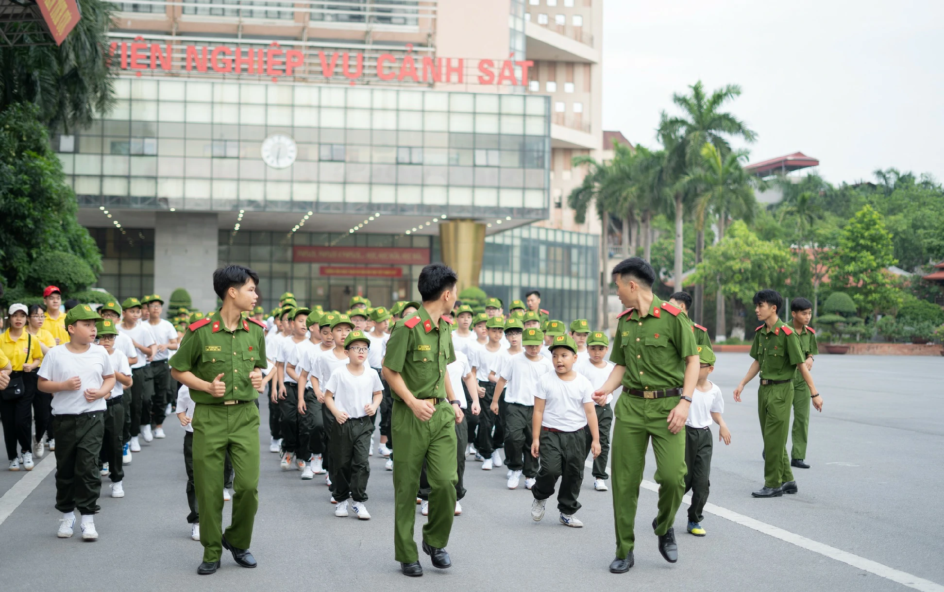 Buổi sáng đầu tiên thức dậy tại Học viện Cảnh sát nhân dân với không khí trong lành, thoáng mát, các chiến sĩ công an nhí đã được báo thức từ 5 giờ 30 theo đúng quy định để tập thể dục.