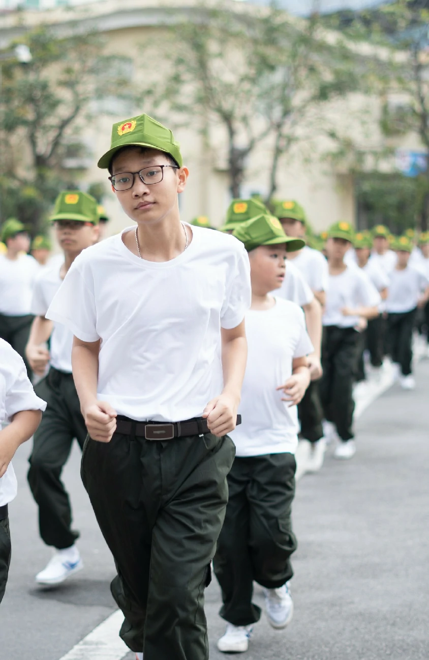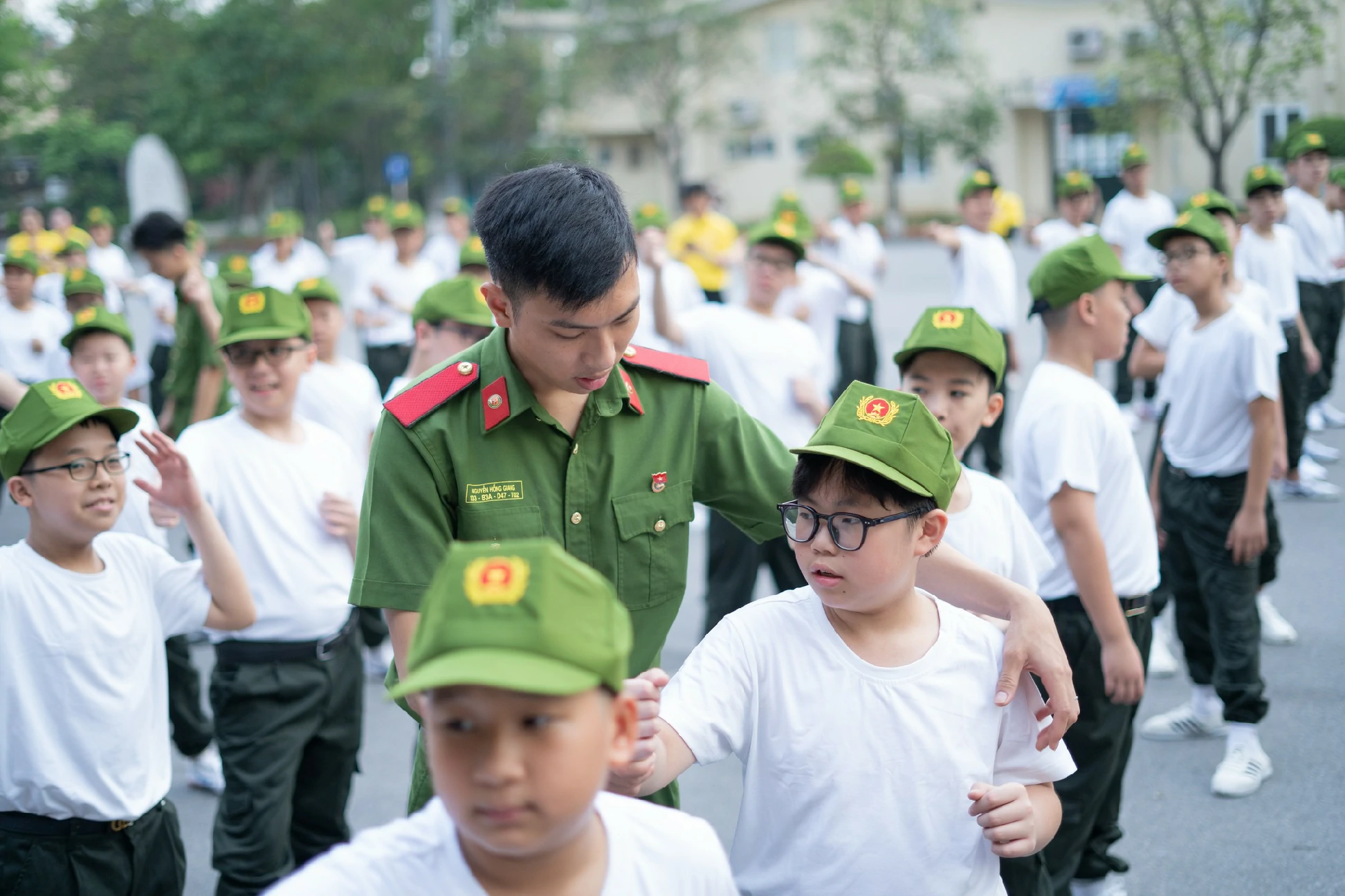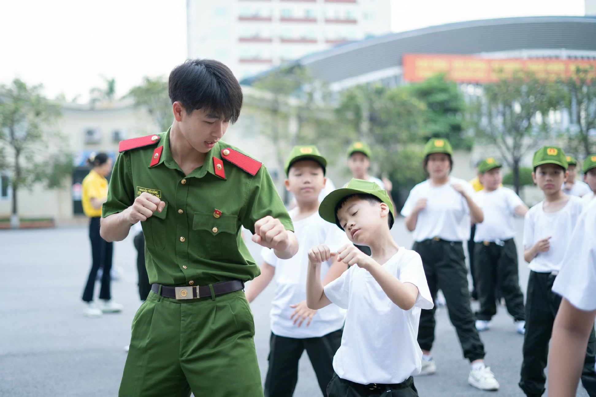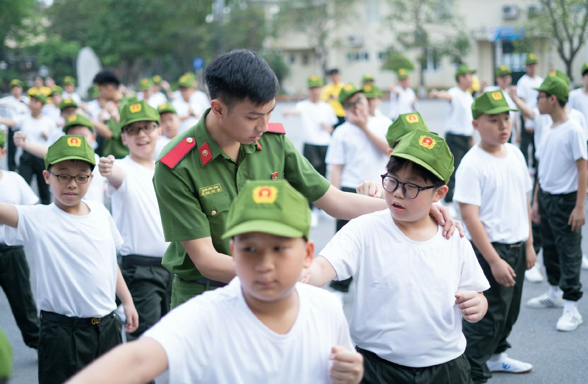 Buổi sáng đầu tiên thức dậy tại Học viện Cảnh sát nhân dân với không khí trong lành, thoáng mát, các chiến sĩ công an nhí đã được báo thức từ 5 giờ 30 theo đúng quy định để tập thể dục.