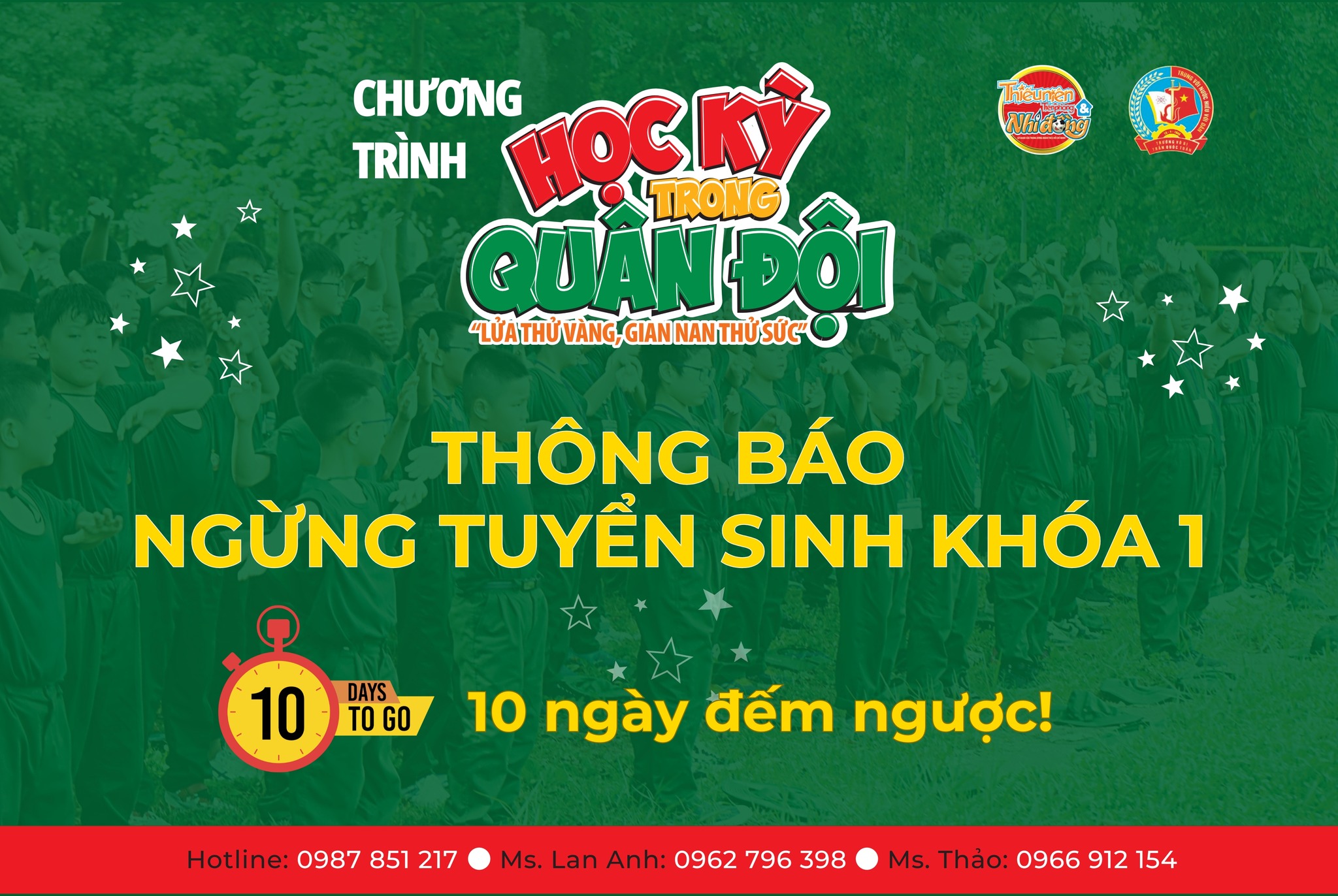 BTC Học kỳ trong Quân đội vẫn tiếp tục tuyển sinh các Khóa 2, 3 và 4. Phụ huynh và học viên quan tâm vui lòng đăng ký sớm để đảm bảo suất tham gia, vì số lượng có hạn nhằm đảm bảo chất lượng chương trình.