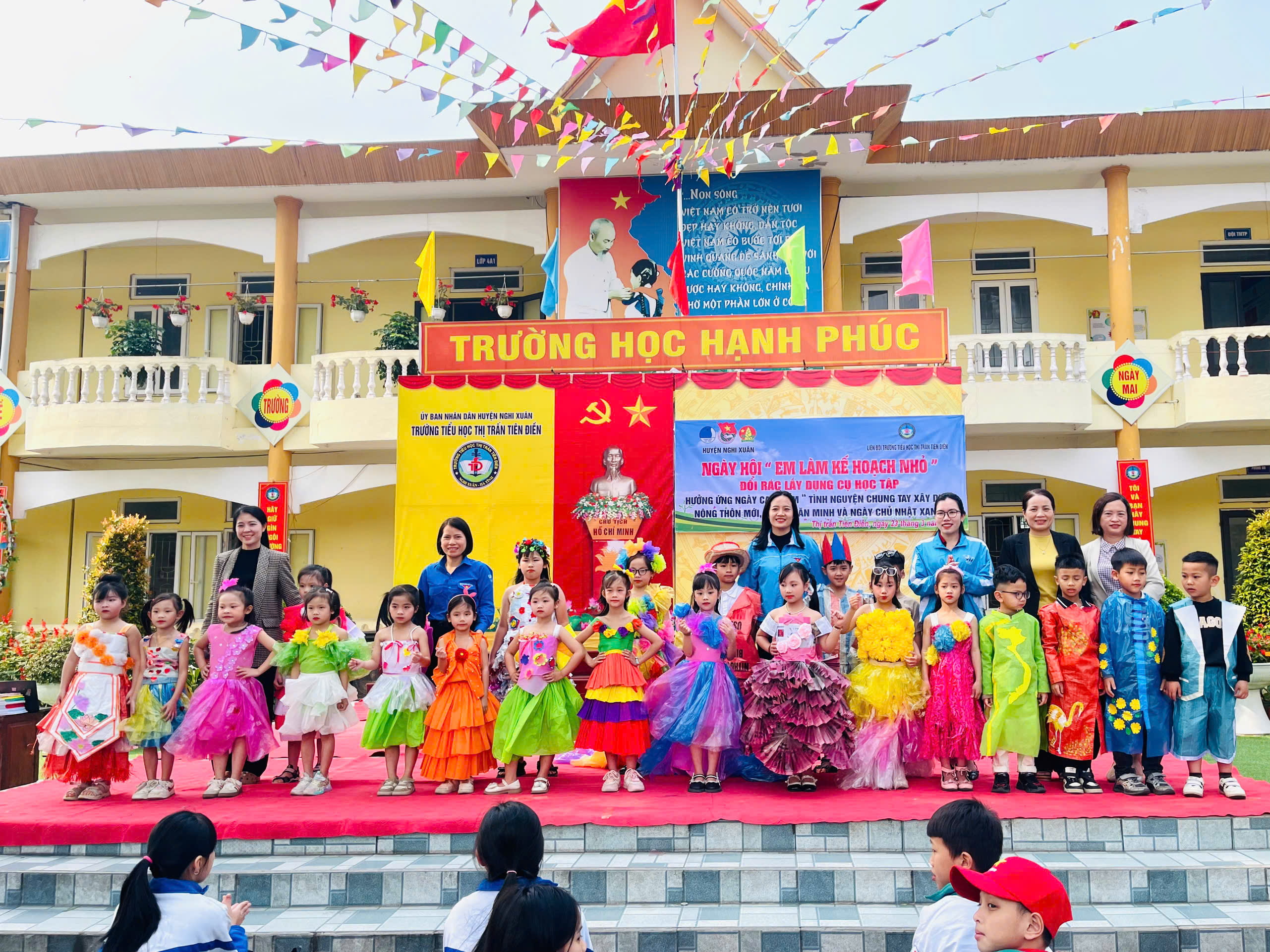 Mở đầu chương trình với chuỗi tiết mục văn nghệ vô cùng sôi động, đặc sắc, đặc biệt là màn trình diễn thời trang tái chế đầy sáng tạo từ những "siêu mẫu nhí" của trường. Những bộ trang phục được làm từ giấy báo, bìa carton, bao nilon… không chỉ gây ấn tượng mạnh mà còn truyền đi thông điệp thiết thực về bảo vệ môi trường.