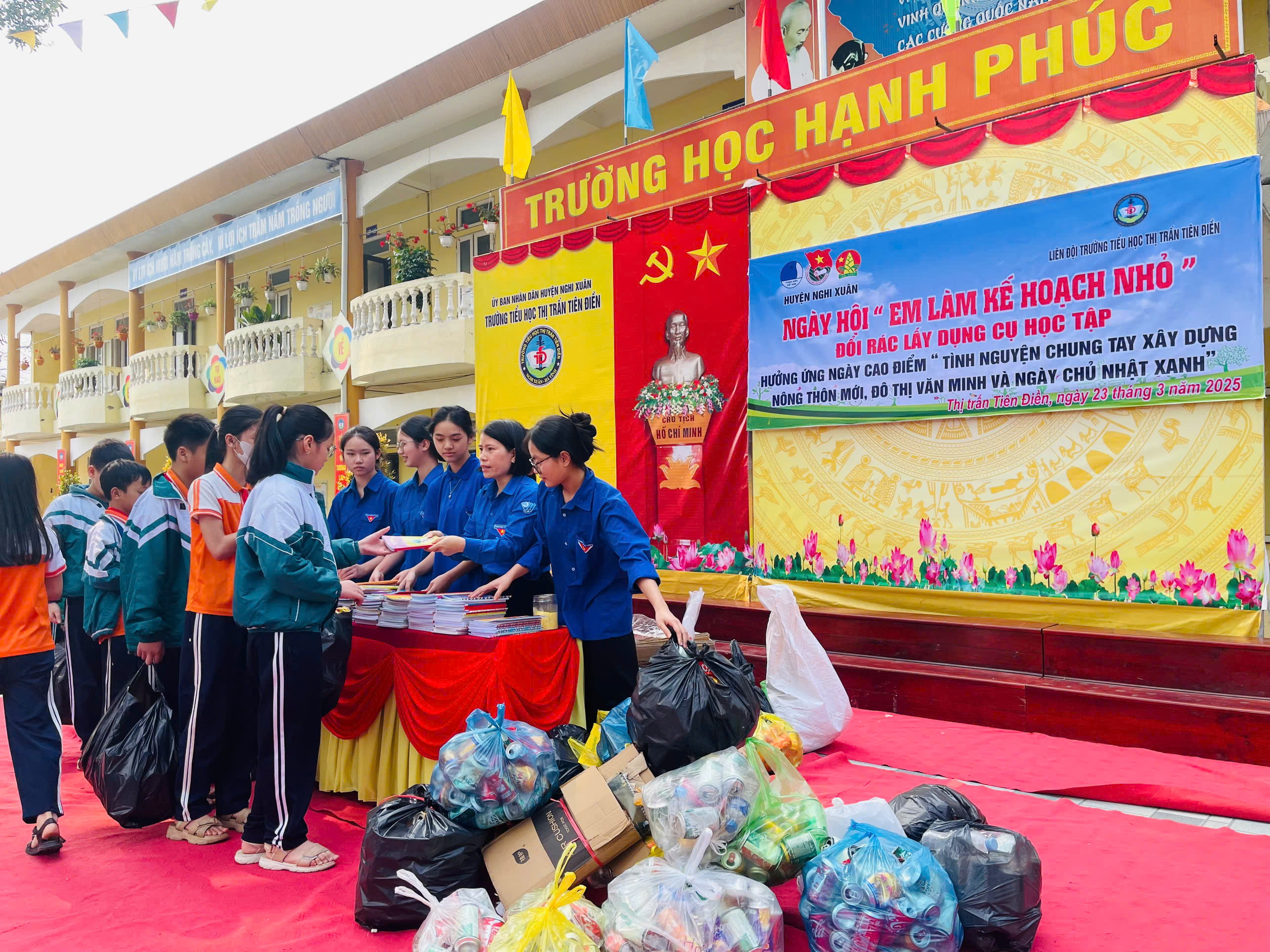 Điểm nhấn của chương trình chính là hoạt động “Đổi phế liệu lấy dụng cụ học tập”. Các bạn nhỏ mang đến những vật liệu đã qua sử dụng như giấy vụn, chai nhựa, lon bia… để đổi lấy các món quà ý nghĩa như vở, bút, thước kẻ. Qua đó, các em vừa góp phần bảo vệ môi trường, vừa nhận về những phần quà thiết thực phục vụ cho việc học tập.